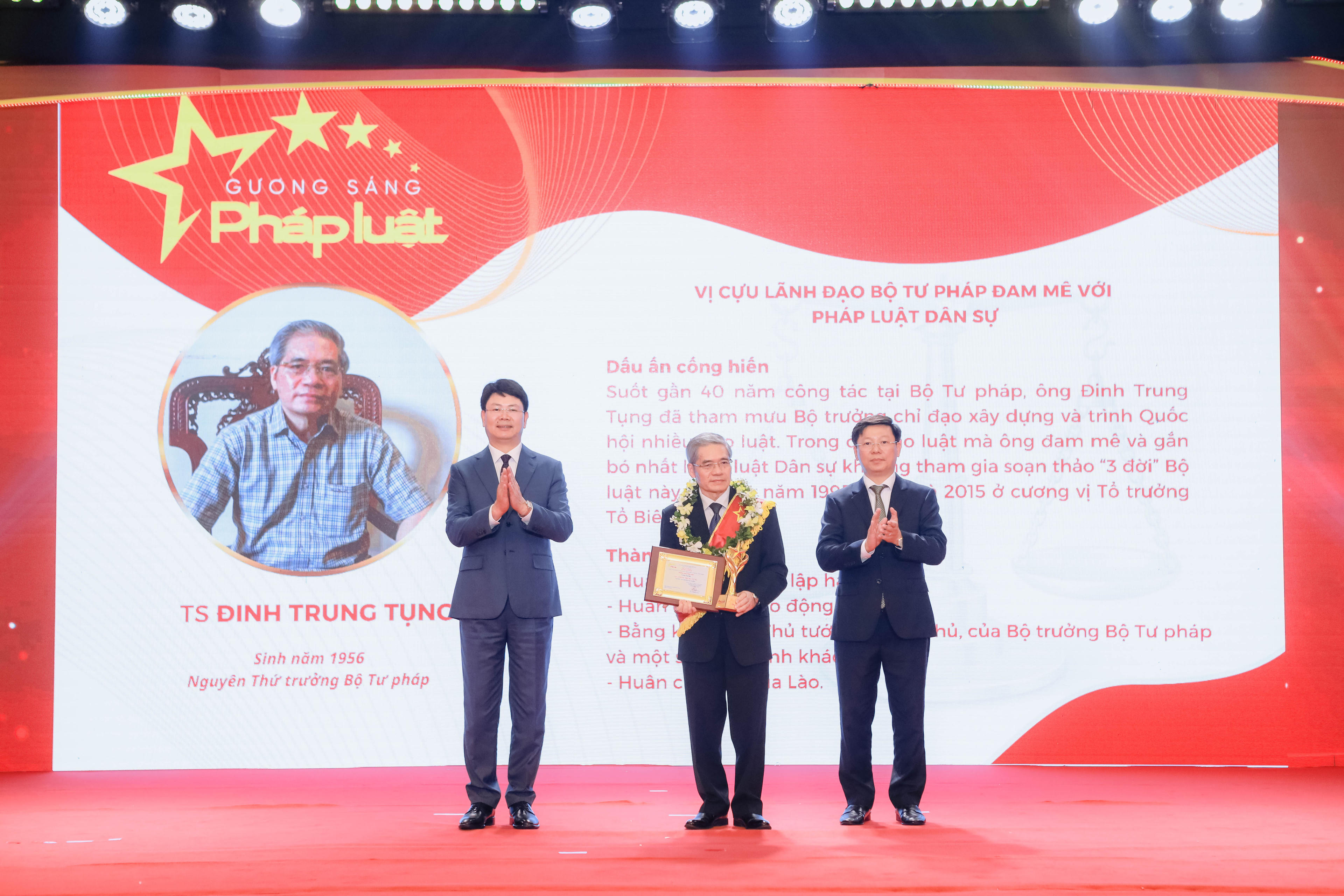 TS. Đinh Trung Tụng (sinh năm 1956, nguyên Thứ trưởng Bộ Tư pháp): Suốt gần 40 năm công tác tại Bộ Tư pháp, ông Đinh Trung Tụng đã tham mưu cho Bộ trưởng chỉ đạo xây dựng và trình Quốc hội nhiều đạo luật. Trong đó, đạo luật mà ông đam mê và gắn bó nhất là Bộ luật Dân sự khi ông tham gia soạn thảo “3 đời” Bộ luật này vào các năm 1995, 2005 và 2015 ở cương vị Tổ trưởng Tổ Biên tập. Huân chương Độc lập hạng Ba. Về thành tích: Ông vinh dự tặng thưởng Huân chương Lao động hạng Nhì; Bằng khen của Thủ tướng Chính phủ, Bộ trưởng Bộ Tư pháp và một số Bộ, ngành khác; Huân chương của Lào.