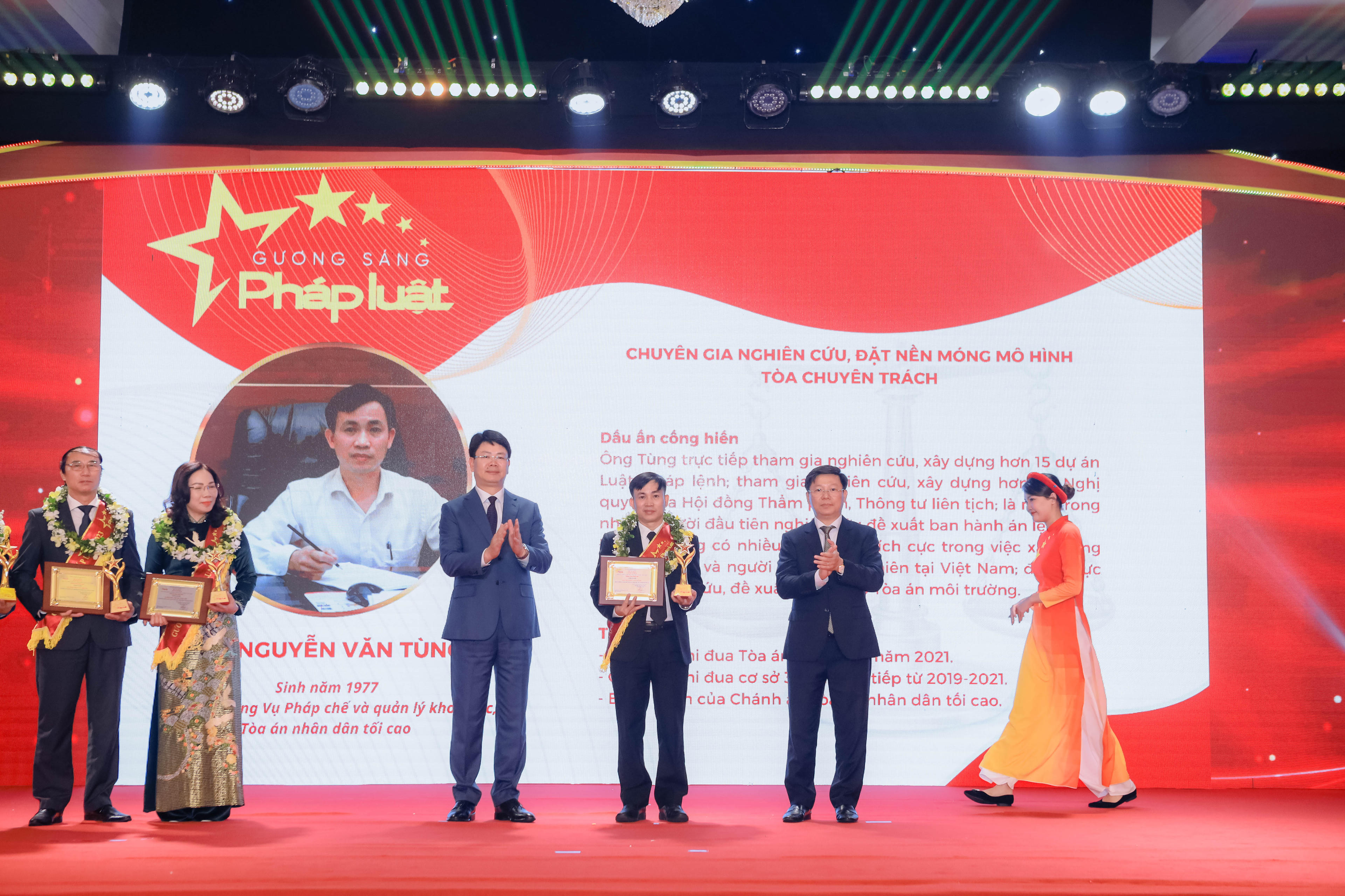 Ông Nguyễn Văn Tùng (sinh năm 1977, Phó Vụ trưởng Vụ Pháp chế và Quản lý khoa học, Tòa án Nhân dân tối cao): Ông Tùng trực tiếp tham gia nghiên cứu, xây dựng hơn 15 dự án Luật, Pháp lệnh; Tham gia nghiên cứu, xây dựng hơn 20 Nghị quyết của Hội đồng Thẩm phán, Thông tư liên tịch; Là một trong những người đầu tiên nghiên cứu đề xuất ban hành án lệ. Đặc biệt, ông có nhiều đóng góp tích cực trong việc xây dựng Tòa gia đình và người chưa thành niên tại Việt Nam; Đang trực tiếp nghiên cứu, đề xuất thành lập Tòa án môi trường. Về thành tích: Ông đạt danh hiệu Chiến sỹ thi đua Tòa án nhân dân năm 2021; Chiến sỹ thi đua cơ sở 3 năm liên tiếp từ 2019-2021; Bằng khen của Chánh án Tòa án Nhân dân tối cao…