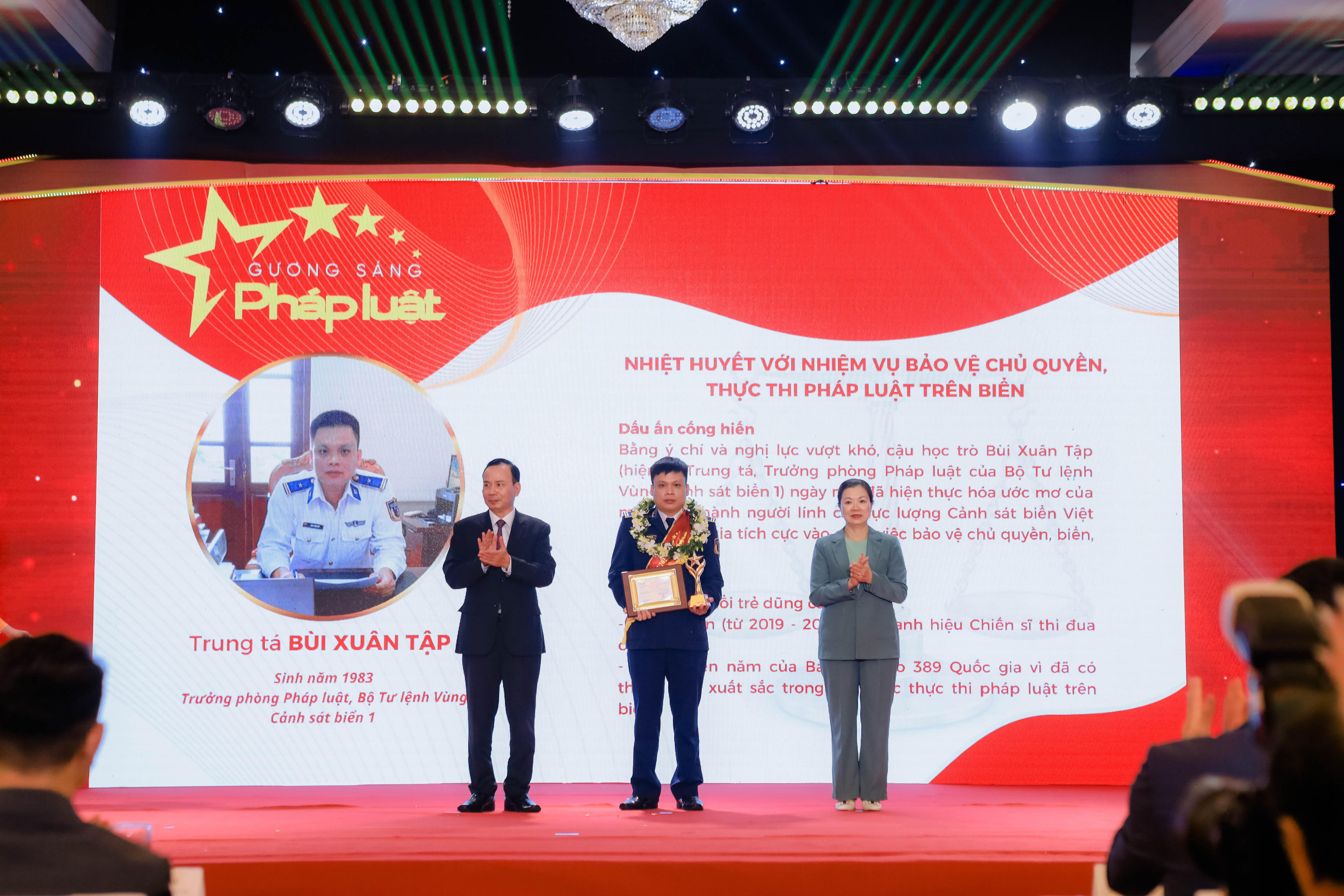 Trung tá Bùi Xuân Tập (sinh năm 1983, Trưởng Phòng Pháp luật, Bộ Tư lệnh Vùng Cảnh sát biển 1): Bằng ý chí và nghị lực vượt khó, cậu học trò Bùi Xuân Tập ngày nào đã hiện thực hóa ước mơ của mình trở thành người lính của lực lượng Cảnh sát biển Việt Nam, tham gia tích cực vào công việc bảo vệ chủ quyền, biển, đảo Tổ quốc. Thành tích: Huy hiệu Tuổi trẻ dũng cảm; 4 năm liền (từ 2019 - 2022) đạt danh hiệu Chiến sĩ thi đua cấp cơ sở; Bằng khen của Ban Chỉ đạo 389 Quốc gia vì đã có thành tích xuất sắc trong công tác thực thi pháp luật trên biển;