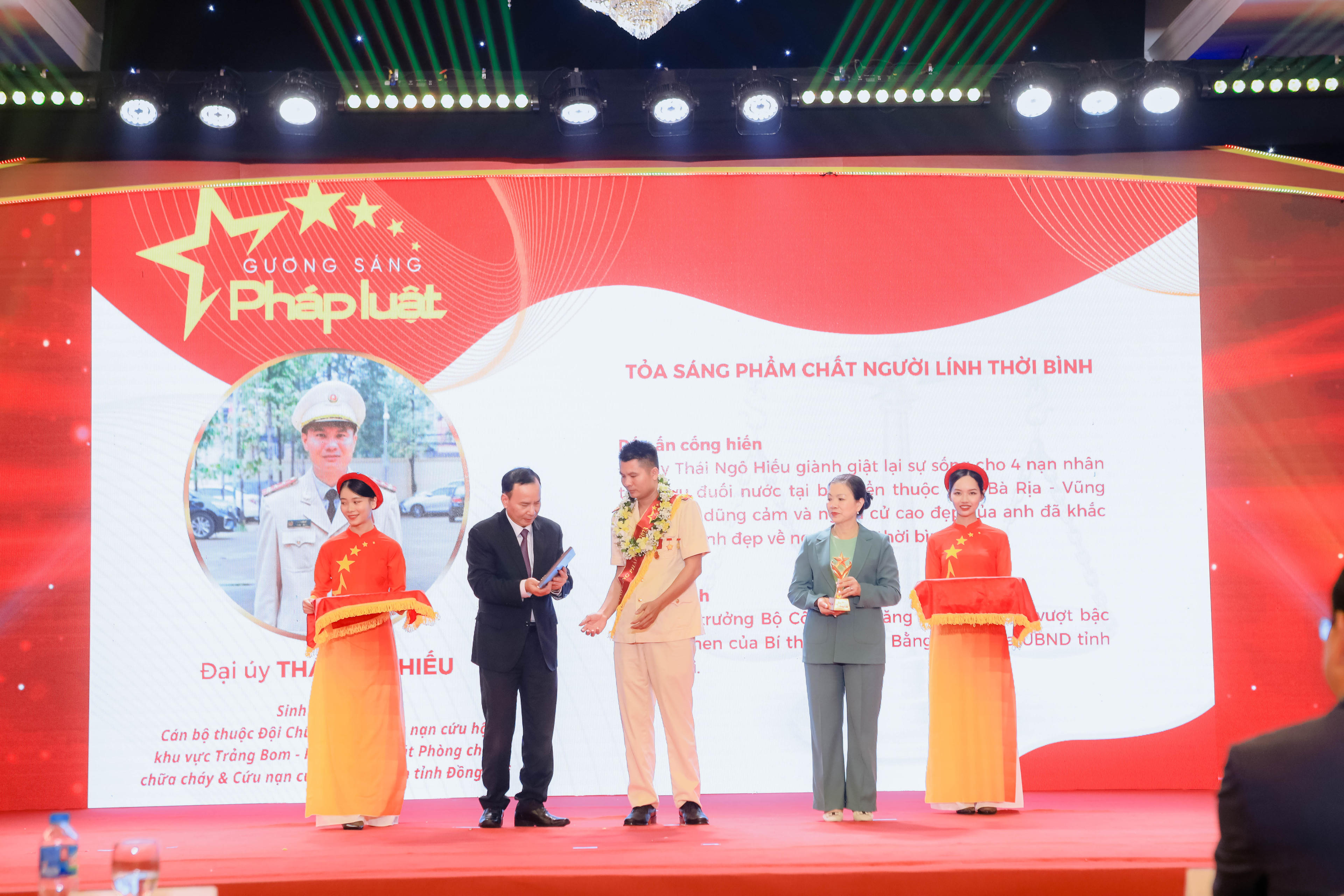 Đại úy Thái Ngô Hiếu (sinh năm 1989, cán bộ thuộc Đội Chữa cháy & Cứu nạn cứu hộ khu vực Trảng Bom - Phòng Cảnh sát Phòng cháy chữa cháy & Cứu nạn cứu hộ, Công an tỉnh Đồng Nai): Đại úy Thái Ngô Hiếu là người giành giật lại sự sống cho 4 nạn nhân trong vụ đuối nước tại bãi biển thuộc tỉnh Bà Rịa - Vũng Tàu. Lòng dũng cảm và nghĩa cử cao đẹp của anh đã khắc họa hình ảnh đẹp về người lính thời bình. Với nghĩa cử cao đẹp này, anh được Bộ trưởng Bộ Công an thăng cấp bậc hàm vượt bậc và Thư khen của Bí thư Tỉnh ủy, Bằng khen của UBND tỉnh Đồng Nai;