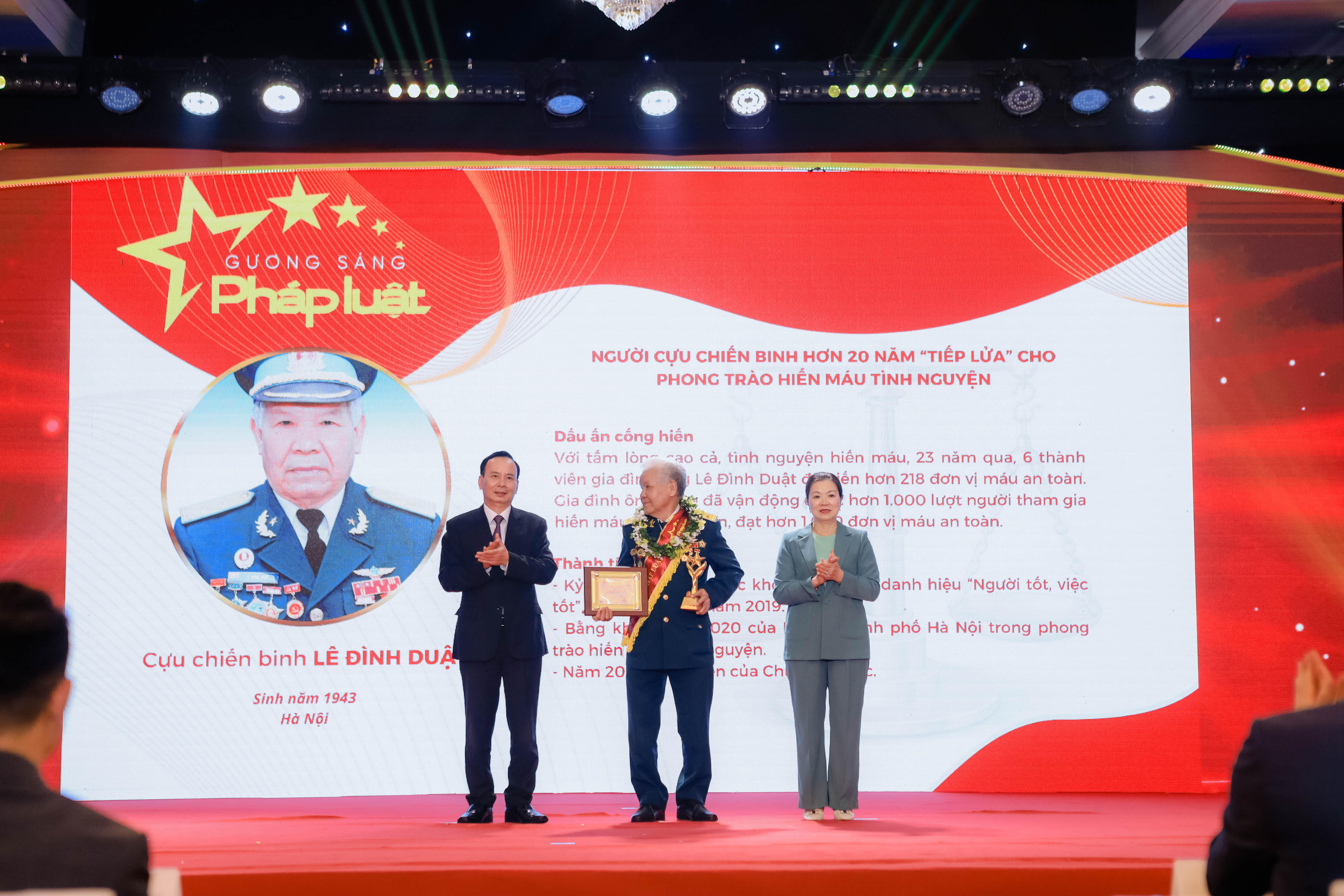 Cựu chiến binh Lê Đình Duật (sinh năm 1943, Hà Nội): Với tấm lòng cao cả, tình nguyện hiến máu, 23 năm qua, 6 thành viên gia đình ông Lê Đình Duật đã hiến hơn 218 đơn vị máu an toàn. Gia đình ông cũng đã vận động được hơn 1.000 lượt người tham gia hiến máu tình nguyện, đạt hơn 1.000 đơn vị máu an toàn. Thành tích: Kỷ niệm chương Vì sức khỏe nhân dân, danh hiệu “Người tốt, việc tốt” cấp thành phố năm 2019; Bằng khen năm 2020 của UBND thành phố Hà Nội trong phong trào hiến máu tình nguyện; Năm 2022 Thư khen của Chủ tịch nước;