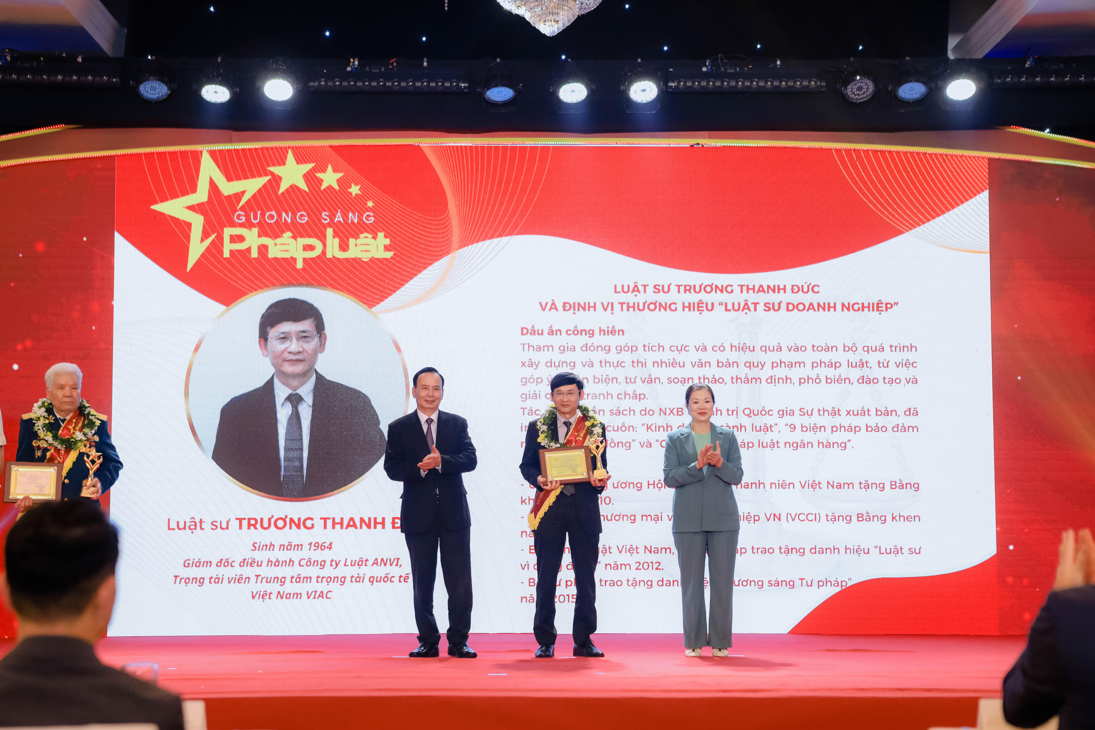 Luật sư Trương Thanh Đức (sinh năm 1964, Giám đốc điều hành Công ty Luật ANVI, Trọng tài viên Trung tâm Trọng tài quốc tế Việt Nam (VIAC): Luật sư Trương Thanh Đức tham gia đóng góp tích cực và có hiệu quả vào toàn bộ quá trình xây dựng và thực thi nhiều văn bản quy phạm pháp luật, từ việc góp ý, phản biện, tư vấn, soạn thảo, thẩm định, phổ biến, đào tạo và giải quyết tranh chấp; Là tác giả 3 cuốn sách do NXB Chính trị Quốc gia Sự thật xuất bản, đã in hơn 17.000 cuốn: “Kinh doanh sành luật”, “9 biện pháp bảo đảm nghĩa vụ hợp đồng” và “Cẩm nang pháp luật ngân hàng”. Thành tích: Luật sư Trương Thanh Đức được Ủy ban Trung ương Hội Liên hiệp Thanh niên Việt Nam tặng Bằng khen năm 2010; Liên đoàn Thương mại và Công nghiệp VN (VCCI) tặng Bằng khen năm 2012; Báo Pháp luật Việt Nam, Bộ Tư pháp trao tặng danh hiệu “Luật sư vì cộng đồng” năm 2012; Bộ Tư pháp trao tặng danh hiệu “Gương sáng Tư pháp” năm 2015;