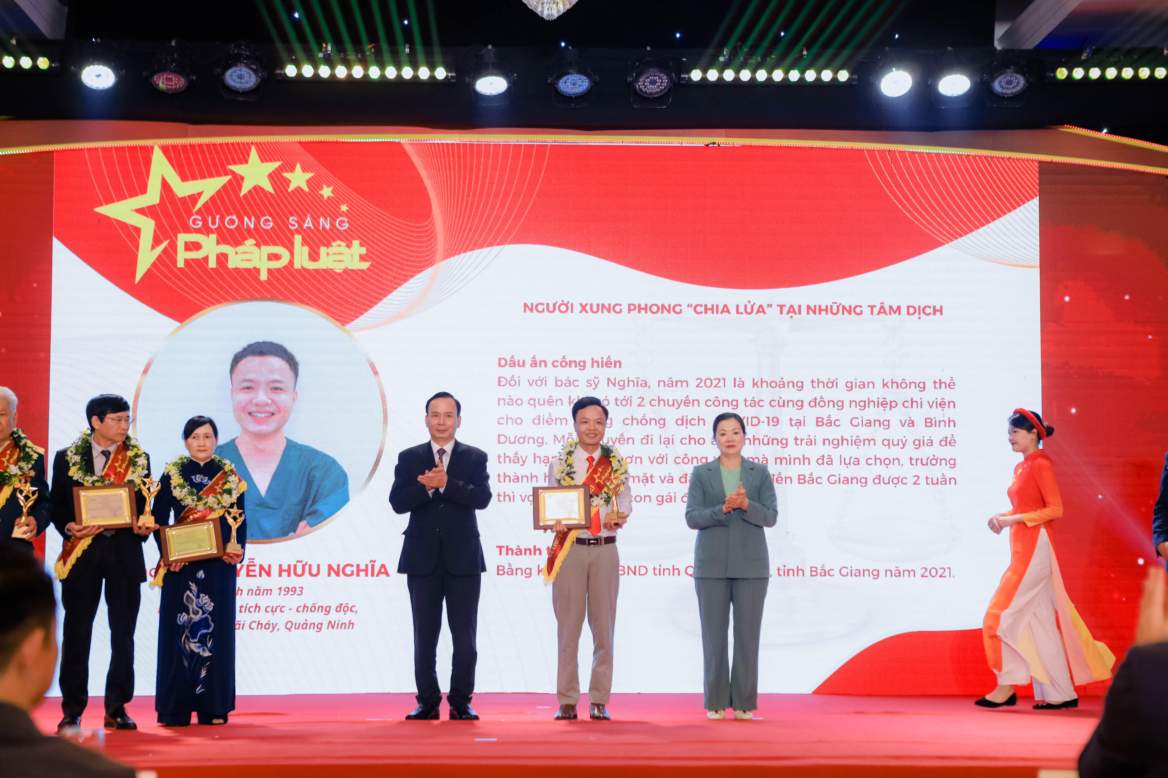 Bác sỹ Nguyễn Hữu Nghĩa (sinh năm 1993, Khoa Hồi sức tích cực - chống độc, Bệnh viện Bãi Cháy, Quảng Ninh): Đối với bác sỹ Nghĩa, năm 2021 là khoảng thời gian không thể nào quên khi có tới 2 chuyến công tác cùng đồng nghiệp chi viện cho điểm nóng chống dịch COVID-19 tại Bắc Giang và Bình Dương. Mỗi chuyến đi lại cho anh những trải nghiệm quý giá để thấy hạnh phúc hơn với công việc mà mình đã lựa chọn, trưởng thành hơn về mọi mặt và đặc biệt khi đến Bắc Giang được 2 tuần thì vợ anh đã sinh con gái đầu lòng. Thành tích: Bằng khen của UBND tỉnh Quảng Ninh, tỉnh Bắc Giang năm 2021;