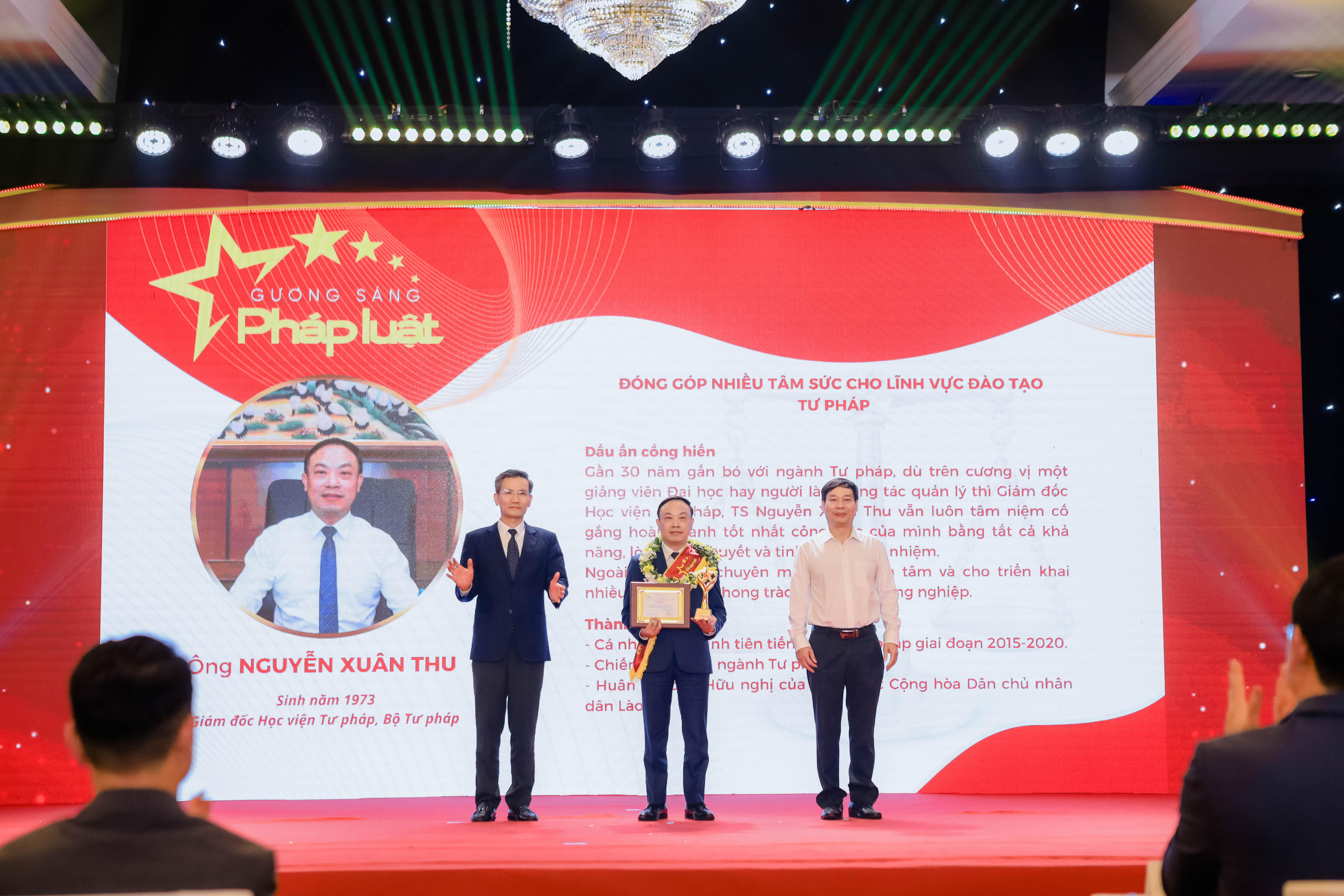 Ông Nguyễn Xuân Thu (sinh năm 1973, Giám đốc Học viện Tư pháp, Bộ Tư pháp): Gần 30 năm gắn bó với ngành Tư pháp, dù trên cương vị một giảng viên Đại học hay người làm công tác quản lý thì Giám đốc Học viện Tư pháp, TS Nguyễn Xuân Thu vẫn luôn tâm niệm cố gắng hoàn thành tốt nhất công việc của mình bằng tất cả khả năng, lòng nhiệt huyết và tinh thần trách nhiệm. Ngoài nhiệm vụ chuyên môn, ông quan tâm và cho triển khai nhiều hoạt động phong trào, từ thiện, hướng nghiệp. “Cá nhân điển hình tiên tiến ngành Tư pháp giai đoạn 2015-2020”. Thành tích: Chiến sỹ thi đua ngành Tư pháp; Huân chương Hữu nghị của Nhà nước Cộng hòa Dân chủ nhân dân Lào...;