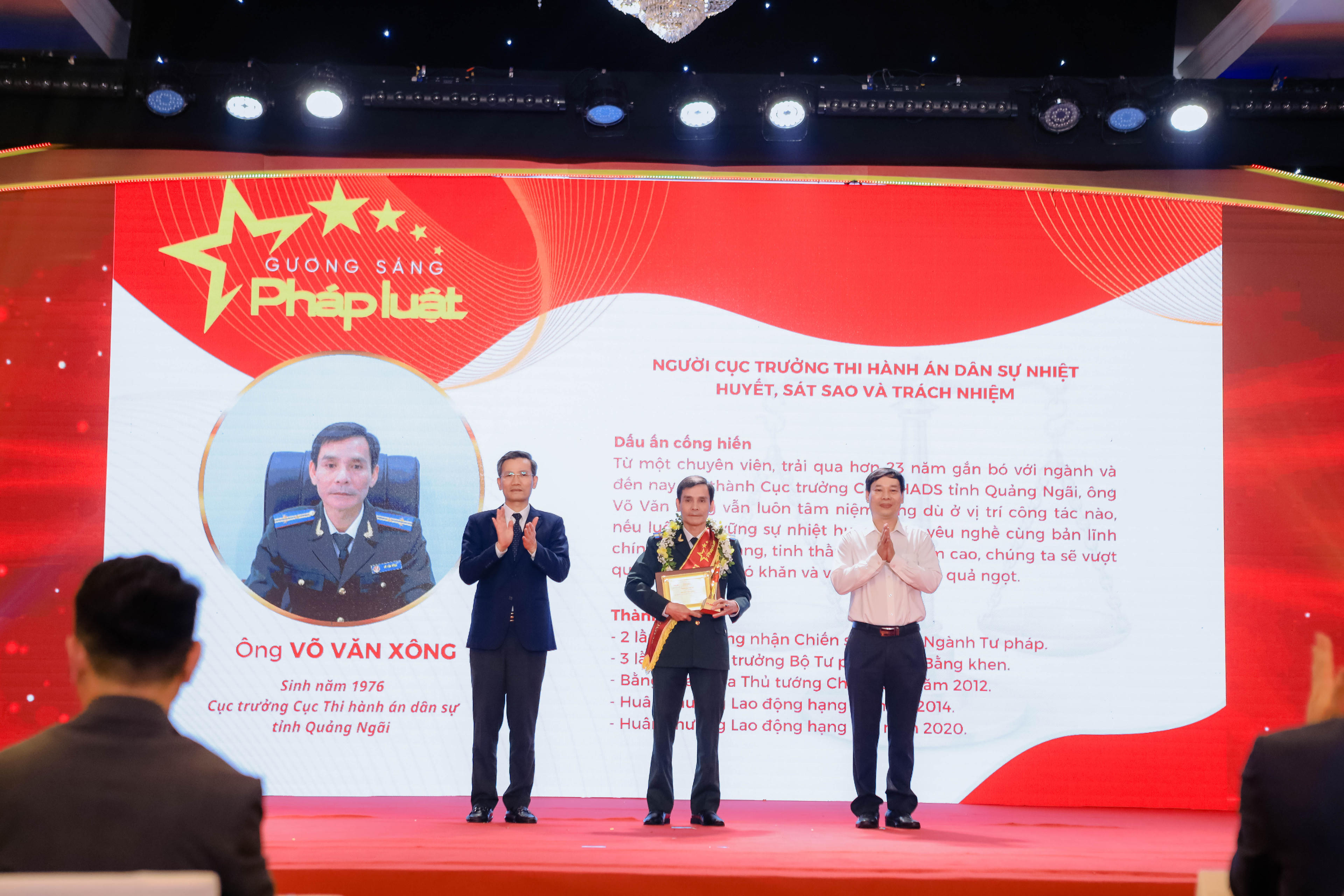 Ông Võ Văn Xông (sinh năm 1976, Cục trưởng Cục Thi hành án dân sự tỉnh Quảng Ngãi): Từ một chuyên viên, trải qua hơn 23 năm gắn bó với ngành và đến nay trở thành Cục trưởng Cục Thi hành án dân sự tỉnh Quảng Ngãi, ông Võ Văn Xông vẫn luôn tâm niệm rằng dù ở vị trí công tác nào, nếu luôn giữ vững sự nhiệt huyết, lòng yêu nghề cùng bản lĩnh chính trị vững vàng, tinh thần trách nhiệm cao, chúng ta sẽ vượt qua được mọi khó khăn và gặt hái được quả ngọt. Thành tích: 2 lần được công nhận Chiến sỹ thi đua Ngành Tư pháp; 3 lần được Bộ trưởng Bộ Tư pháp tặng Bằng khen; Bằng khen của Thủ tướng Chính phủ năm 2012; Huân chương Lao động hạng Ba năm 2014 và Huân chương Lao động hạng Nhì năm 2020;