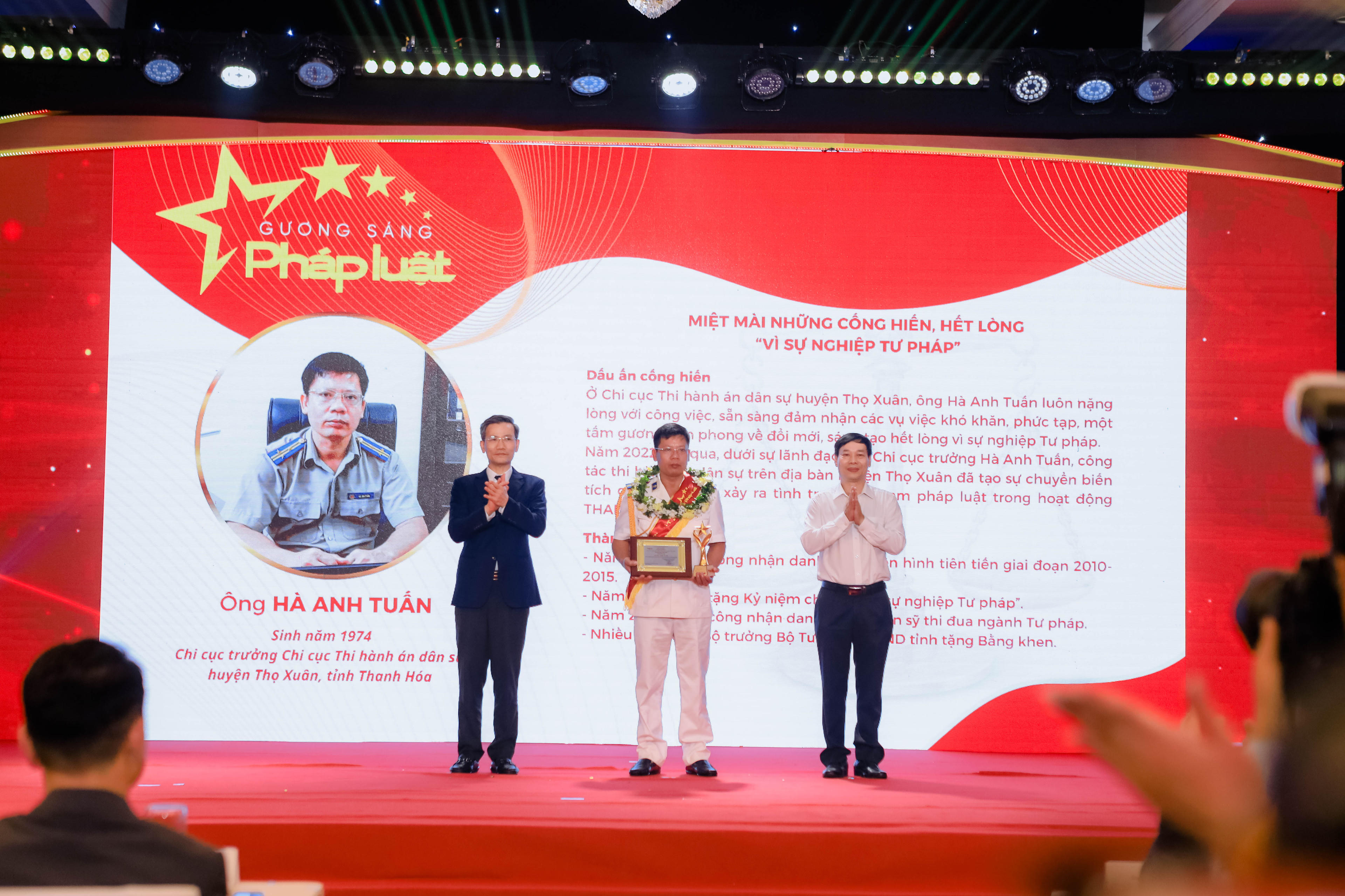 Ông Hà Anh Tuấn (sinh năm 1974, Chi cục trưởng Chi cục Thi hành án dân sự huyện Thọ Xuân, tỉnh Thanh Hóa): Ở Chi cục Thi hành án dân sự huyện Thọ Xuân, ông Hà Anh Tuấn luôn nặng lòng với công việc, sẵn sàng đảm nhận các vụ việc khó khăn, phức tạp, một tấm gương tiên phong về đổi mới, sáng tạo hết lòng vì sự nghiệp Tư pháp. Năm 2022 vừa qua, dưới sự lãnh đạo của Chi cục trưởng Hà Anh Tuấn, công tác thi hành án dân sự trên địa bàn huyện Thọ Xuân đã tạo sự chuyển biến tích cực, không để xảy ra tình trạng vi phạm pháp luật trong hoạt động thi hành án dân sự. Thành tích: Năm 2015 được công nhận danh hiệu Điển hình tiên tiến giai đoạn 2010-2015; Năm 2017, được tặng Kỷ niệm chương “Vì sự nghiệp Tư pháp”; Năm 2019, được công nhận danh hiệu Chiến sỹ thi đua ngành Tư pháp; Nhiều lần được Bộ trưởng Bộ Tư pháp, UBND tỉnh tặng Bằng khen;