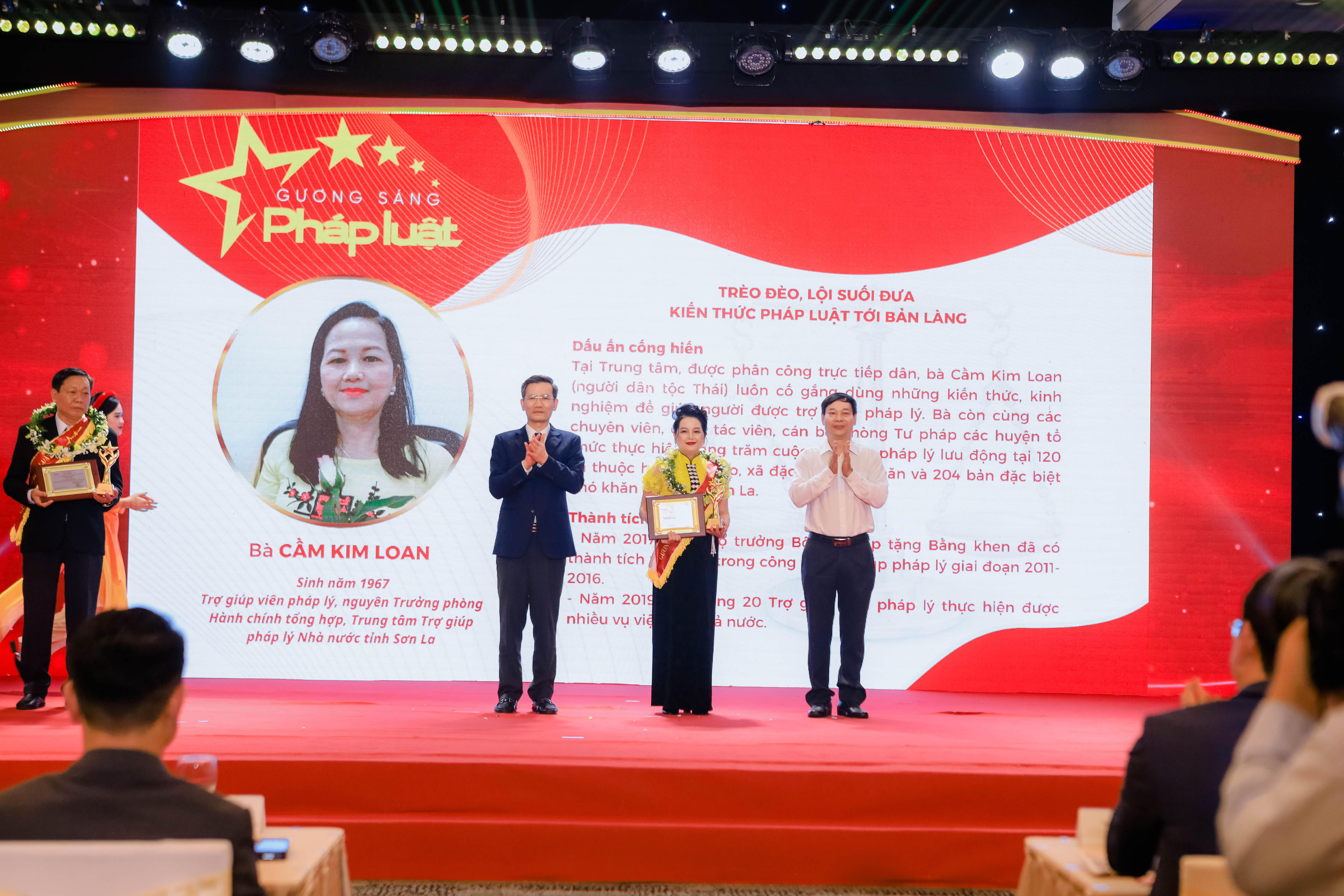 Bà Cầm Kim Loan (sinh năm 1967, Trợ giúp viên pháp lý, nguyên Trưởng phòng Hành chính tổng hợp, Trung tâm Trợ giúp pháp lý Nhà nước tỉnh Sơn La): Tại Trung tâm, được phân công trực tiếp dân, bà Cầm Kim Loan (người dân tộc Thái) luôn cố gắng dùng những kiến thức, kinh nghiệm để giúp người được trợ giúp pháp lý. Bà còn cùng các chuyên viên, cộng tác viên, cán bộ Phòng Tư pháp các huyện tổ chức thực hiện hàng trăm cuộc trợ giúp pháp lý lưu động tại 120 xã thuộc huyện nghèo, xã đặc biệt khó khăn và 204 bản đặc biệt khó khăn của tỉnh Sơn La. Năm 2017 được Bộ trưởng Bộ Tư pháp tặng Bằng khen đã có thành tích xuất sắc trong công tác trợ giúp pháp lý giai đoạn 2011-2016. Thành tích: Năm 2019 là 1 trong 20 Trợ giúp viên pháp lý thực hiện được nhiều vụ việc nhất cả nước;