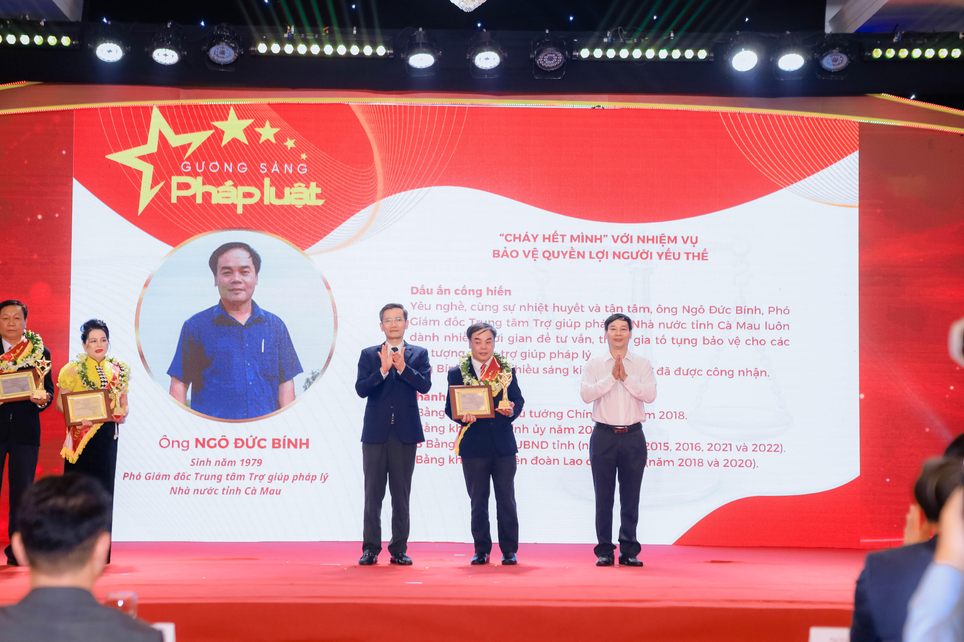 Ông Ngô Đức Bính (sinh năm 1979, Phó Giám đốc Trung tâm Trợ giúp pháp lý Nhà nước tỉnh Cà Mau): Yêu nghề cùng sự nhiệt huyết và tận tâm, ông Ngô Đức Bính - Phó Giám đốc Trung tâm Trợ giúp pháp lý Nhà nước tỉnh Cà Mau luôn dành nhiều thời gian để tư vấn, tham gia tố tụng để bảo vệ cho các đối tượng được trợ giúp pháp lý. Ông còn được công nhận nhiều sáng kiến cấp cơ sở có giá trị. Thành tích: 5 Bằng khen của UBND tỉnh (năm 2010, 2015, 2016, 2021 và 2022); Bằng khen của Liên đoàn Lao động tỉnh (năm 2018 và 2020);