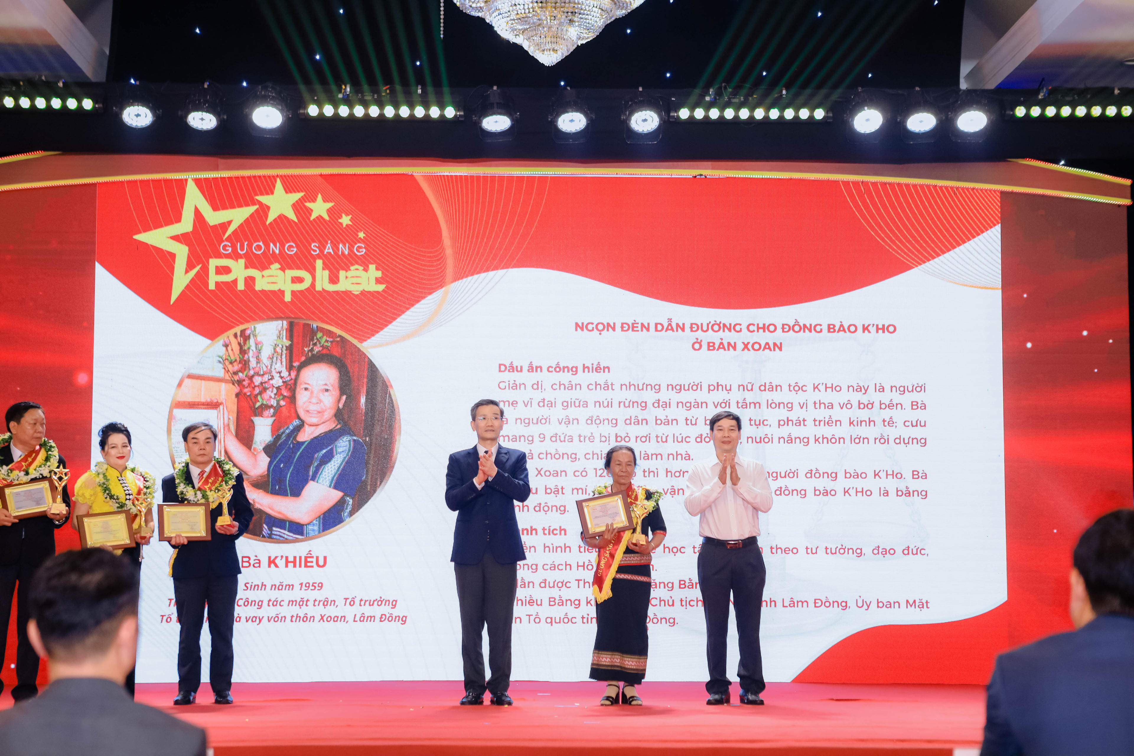 Ở lượt vinh danh thứ hai, ông Cao Huy, Phó Chủ nhiệm Văn phòng Chính phủ, Phó Chủ tịch Hội đồng Phối hợp phổ biến, giáo dục pháp luật Trung ương và ông Đỗ Đức Hồng Hà, Phó Chủ nhiệm Uỷ ban Tư pháp của Quốc hội lên sân khấu trao Cúp, Giấy chứng nhận, ruy băng và hoa cho các Gương sáng tiếp theo: