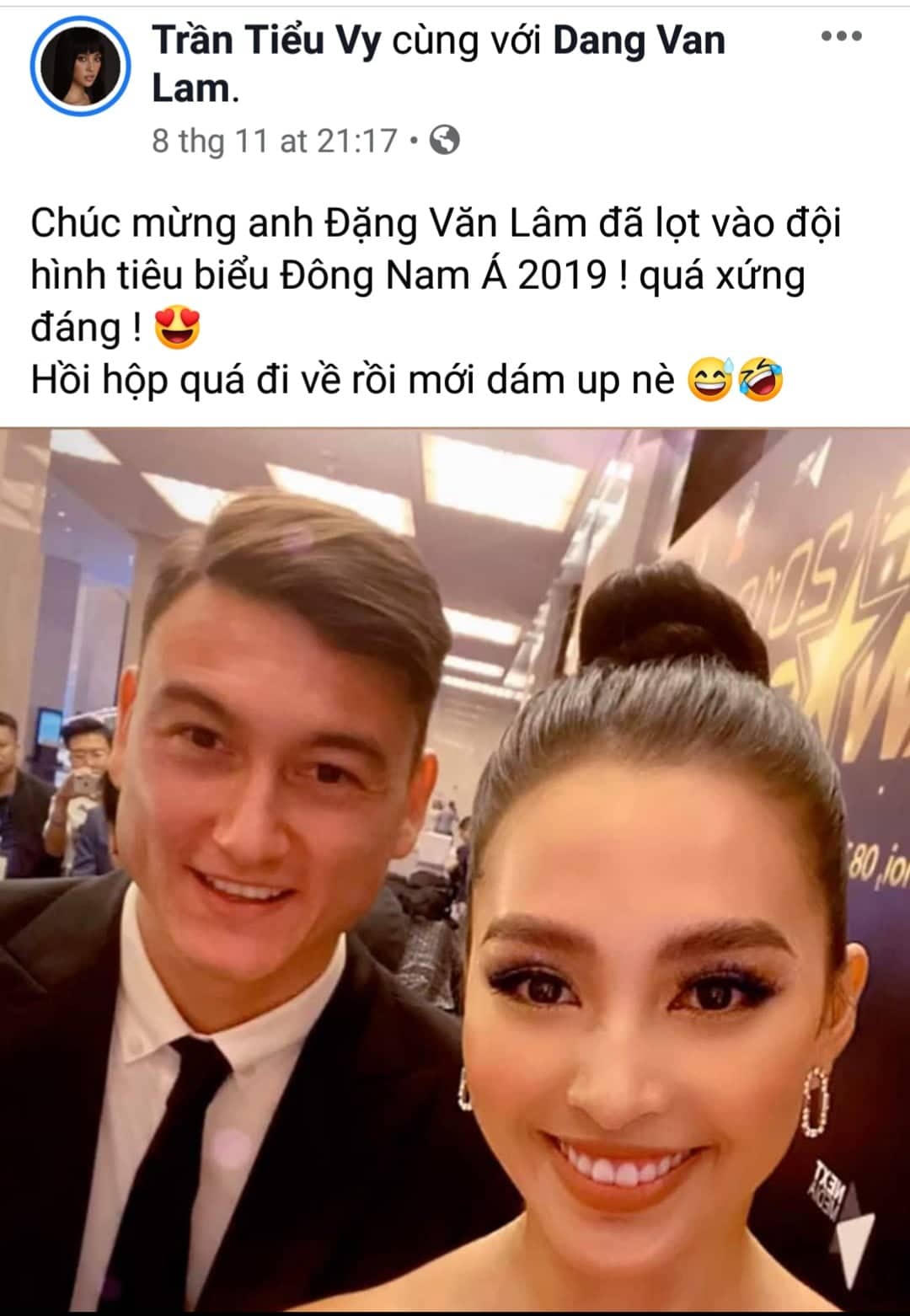 Trên trang cá nhân, hoa hậu Trần Tiểu Vy bày tỏ cảm xúc: “Chúc mừng anh Đặng Văn Lâm đã lọt vào đội hình tiêu biểu Đông Nam Á 2019 ! quá xứng đáng! Hồi hộp quá đi về rồi mới dám up nè”.