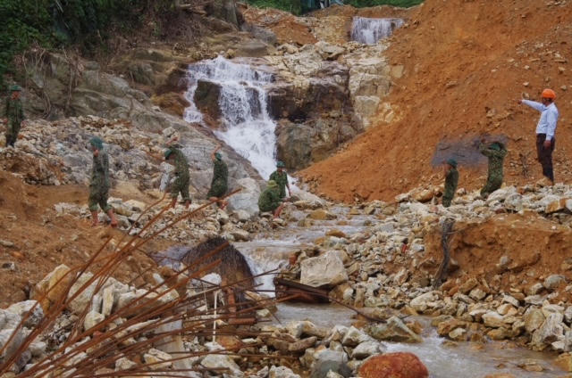 Trung tá Phan Thắng, Phó Chỉ huy trưởng, Tham Mưu trưởng Bộ Chỉ huy Quân sự tỉnh Thừa Thiên Huế cho biết: “Hiện nay các lực lượng tổ chức tìm kiếm khó khăn nhất là lưu tốc của dòng chảy trên sông Rào Trăng 3 hiện tại rất lớn khoảng 15 đến 20m3 nước/giây; vấn đề thứ hai trước lúc anh em cơ động về Sở chỉ huy tiền phương để trú tránh cơn bão số 13 đã đào và nắn được dòng chảy khoảng 60% khối lượng công việc thế nhưng đến thời điểm hiện tại khối lượng đất đá đã bồi lấp tương đối là lớn, chính vì vậy ngày hôm nay chúng tôi đã tập trung tất cả nội lực bằng phương tiện máy móc, kể cả nhân lực để tập trung nắn lại dòng chảy cùng với đó là tập kết đầy đủ các vật liệu để bảo đảm cho đắp đê nắn dòng về phía thượng lưu đạt kết quả tốt”.