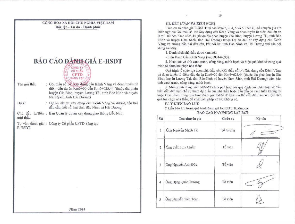 Tại báo cáo đánh giá E-HSDT Công ty Cổ phần CFTD Sáng tạo, Tổ chuyên gia đã đưa ra kết luận về danh sách nhà thầu được xem xét là Liên Danh Cầu Kênh Vàng (vn0107444093).