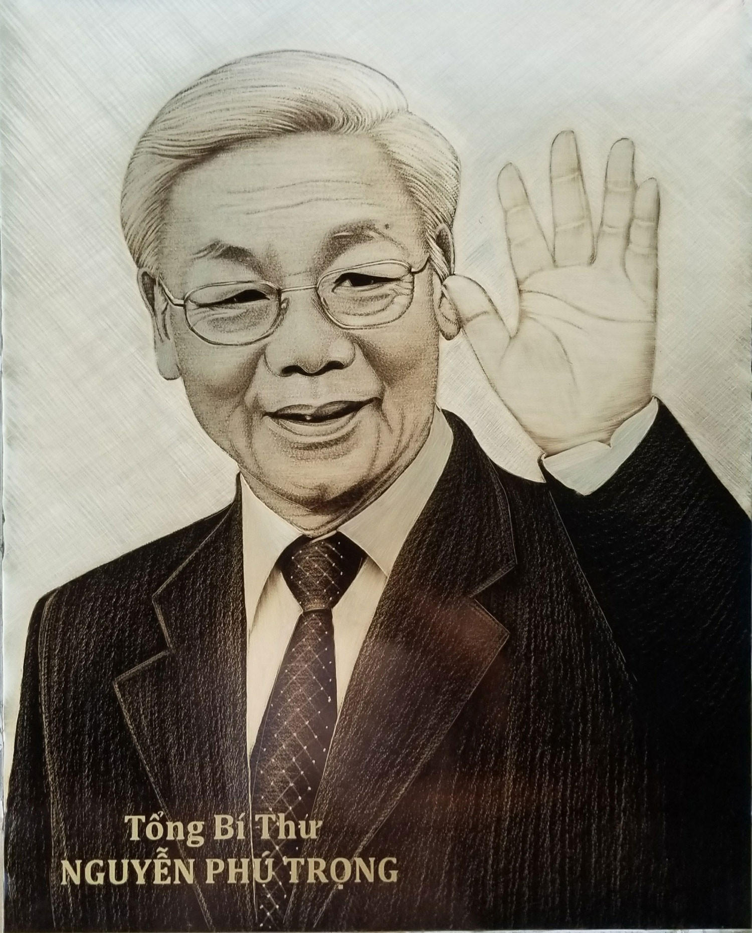 Bức chân dung Tổng Bí thư Nguyễn Phú Trọng được khắc bằng đồng. (Ảnh: Tình Lê) |