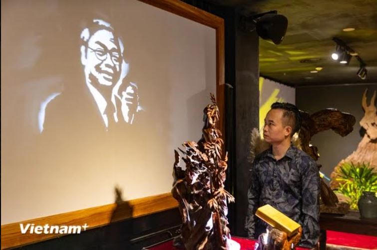 Còn nghệ nhân trẻ Bùi Văn Tự (Gia Lâm, Hà Nội) chia sẻ: “Xuất phát từ hình ảnh cây tre là một biểu tượng văn hóa gắn liền xuyên suốt chiều dài lịch sử dân tộc Việt Nam và như Tổng Bí thư Nguyễn Phú Trọng đã khắc họa cây tre Việt Nam với hình ảnh gốc vững, thân chắc, cành uyển chuyển và với một triết lý là mềm mại mà cứng cỏi, nhân ái mà quật cường, biết nhu biết cương, biết thời biết thế, biết mình biết người. Đó cũng chính là nguồn cảm hứng mà tôi sáng tác nên một tác phẩm điêu khắc ánh sáng với tên gọi là “Cây tre Việt Nam” để khắc họa nên hình ảnh của Tổng Bí thư Nguyễn Phú Trọng”. Tất cả tưởng như chỉ là những khúc gỗ chạm khắc bình thường, nhưng sau khi được chiếu sáng, bóng chiếu của tác phẩm lại phác lên bức chân dung đầy cảm xúc về Tổng Bí thư Nguyễn Phú Trọng.