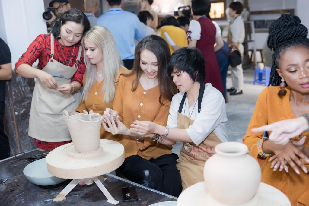 Những người đẹp được trực tiếp nặn gốm, tìm hiểu quy trình làm ra sản phẩm gốm của nghệ nhân Bát Tràng. |