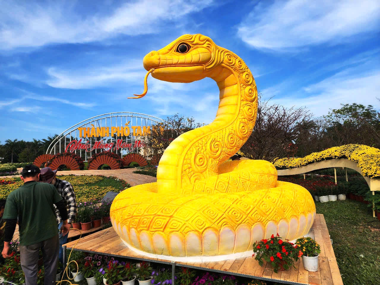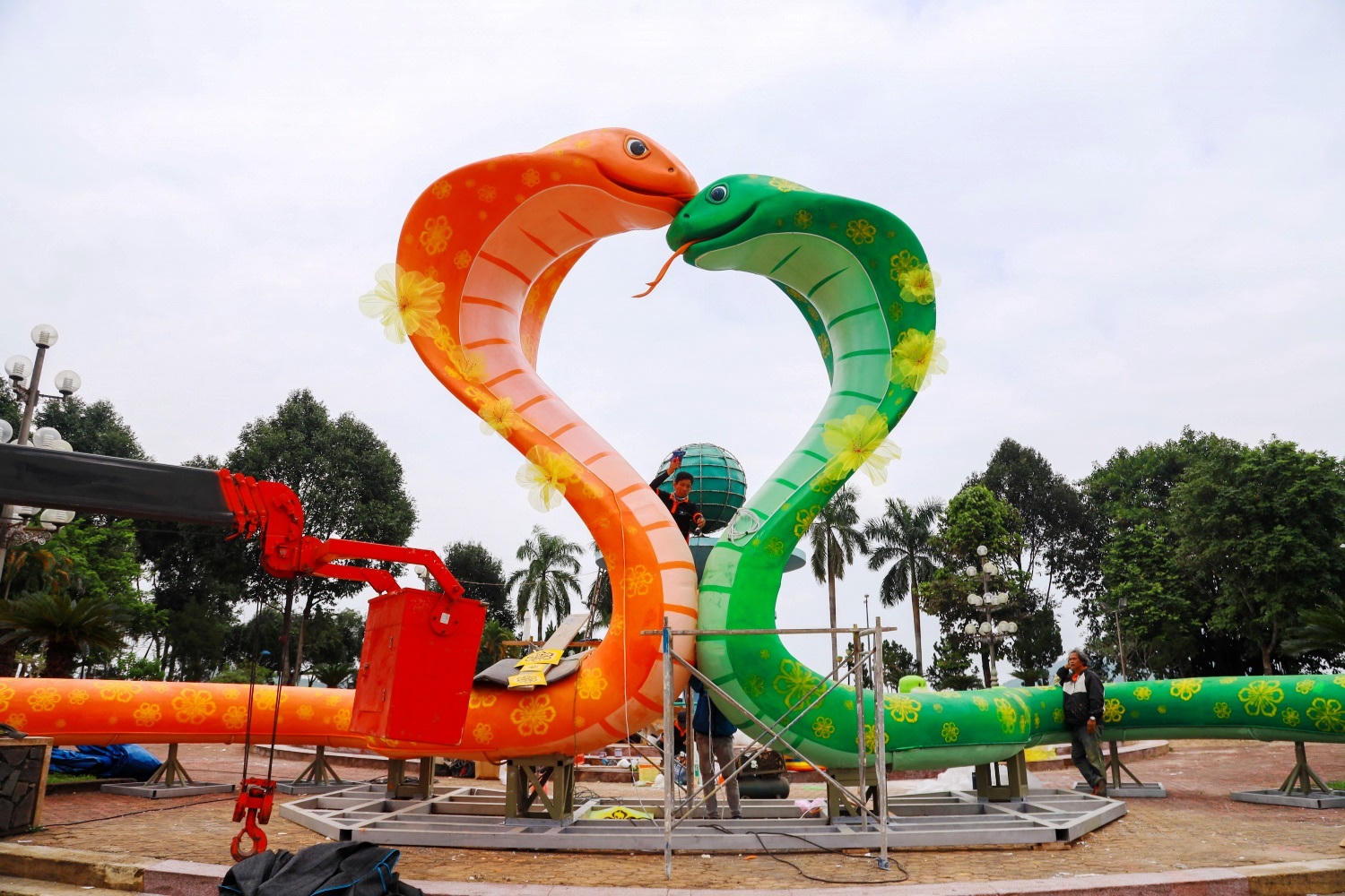Tại khu vực trung tâm quảng trường này, các nghệ nhân cũng tất bật hoàn thành những công đoạn cuối cùng lắp đặt cặp linh vật rắn vàng.