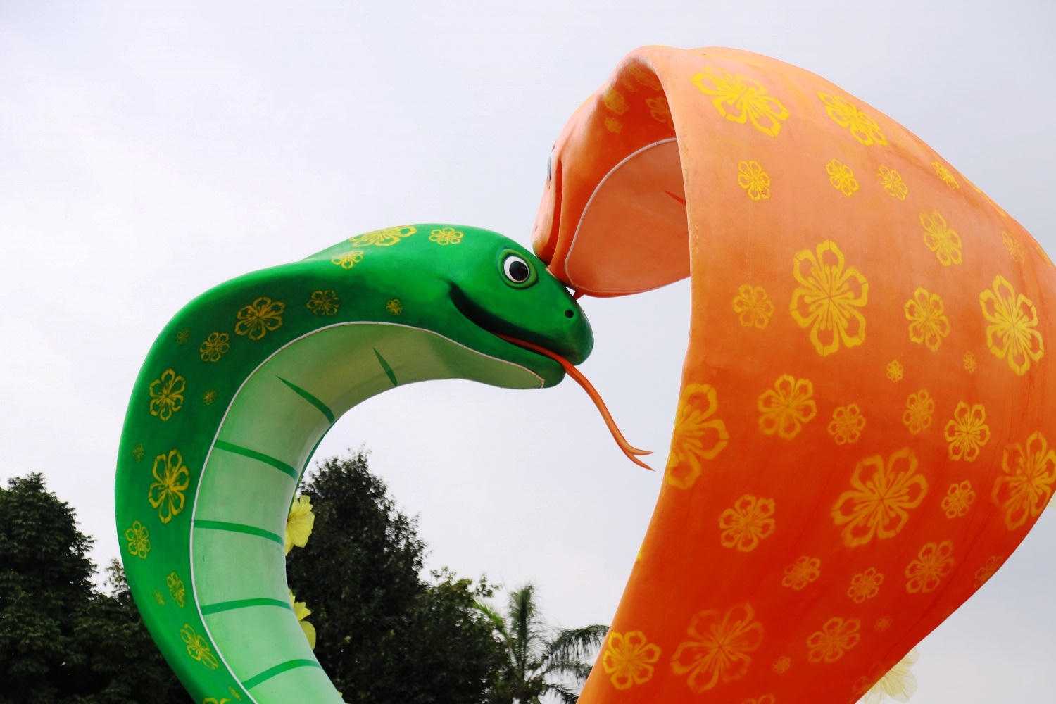 Theo tìm hiểu, cặp rắn vàng này được thành phố “đặt hàng” nghệ nhân ở TP Đà Nẵng chế tác với chất liệu chủ yếu là xốp. Toàn thân cặp rắn nổi bật với màu vàng óng ánh, thân được chạm trổ khá công phu, tỉ mỉ. Trong đó một chú rắn hổ mang với phần đầu vươn lên, phần bụng màu trắng, thân và mang được chạm trổ khá đẹp mắt. Chú rắn phía còn lại cũng cũng khá nổi bật với những đường nét chạm trổ tinh xảo.