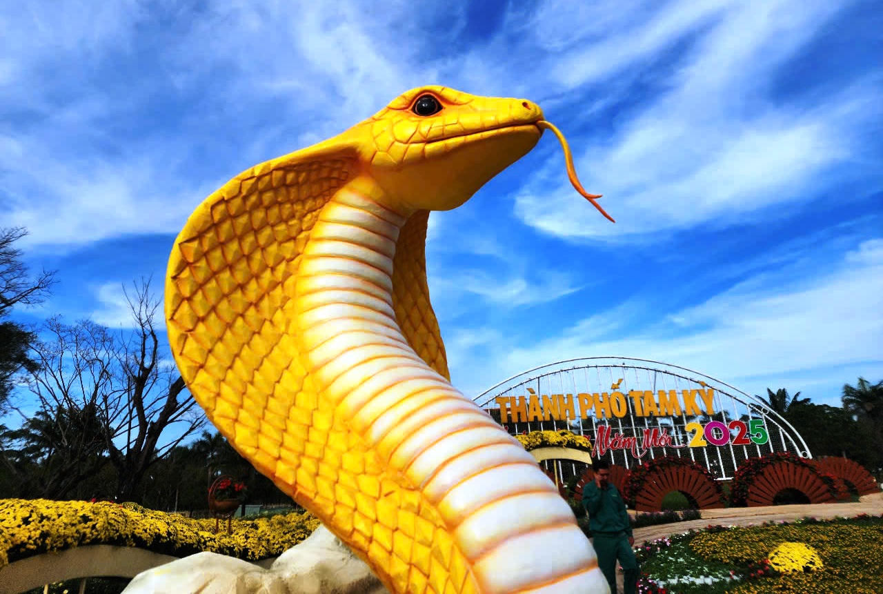 Tại Quảng Nam, sáng 23/1, cặp linh vật rắn vàng đã được xe chở đến quảng trường 24/3 ở TP Tam Kỳ để các nghệ nhân lắp đặt, trang trí hoàn chỉnh.