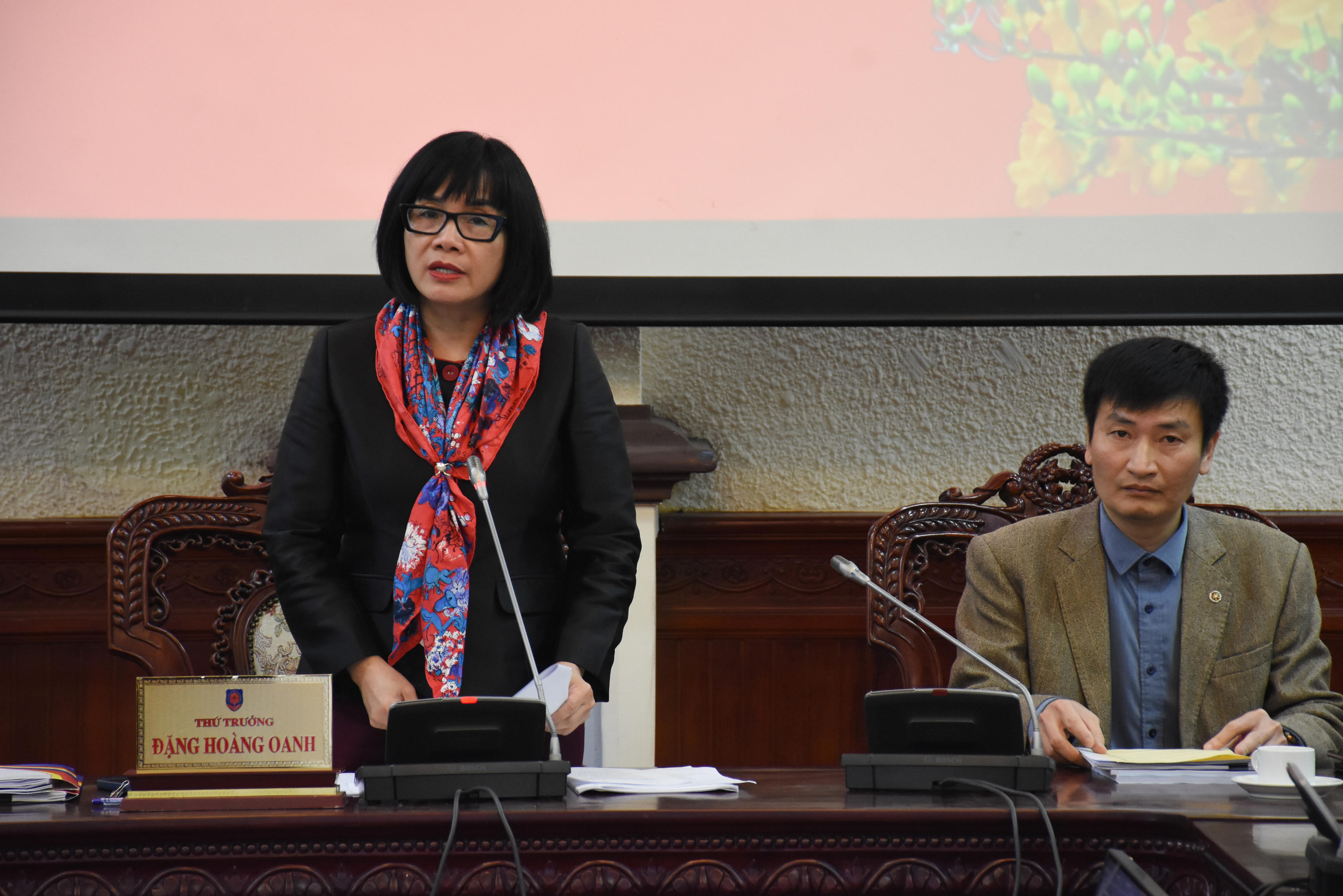 Kết luận buổi làm việc, Thứ trưởng Đặng Hoàng Oanh ghi nhận và biểu dương những nỗ lực, cố gắng và kết quả công tác của năm 2022 mà các Trường cao đẳng Luật đã đạt được. Thứ trưởng cũng nhấn mạnh Nghị quyết số 27-NQ/TW ngày 09/11/2022 của Ban Chấp hành Trung ương Đảng khóa XIII về “tiếp tục xây dựng và hoàn thiện Nhà nước pháp quyền xã hội chủ nghĩa Việt Nam trong giai đoạn mới” đã đề ra nhiều mục tiêu, nhiệm vụ quan trọng, liên quan đến công tác của Bộ, ngành Tư pháp, trong đó xác định nhiệm vụ rất cụ thể đối với công tác đào tạo, bồi dưỡng luật.