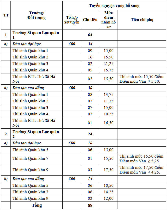 Chỉ tiêu và mức điểm nhận hồ sơ xét tuyển bổ sung vào đào tạo đại học, cao đẳng tại các học viện, trường trong Quân đội năm 2023, cụ thể như sau:
