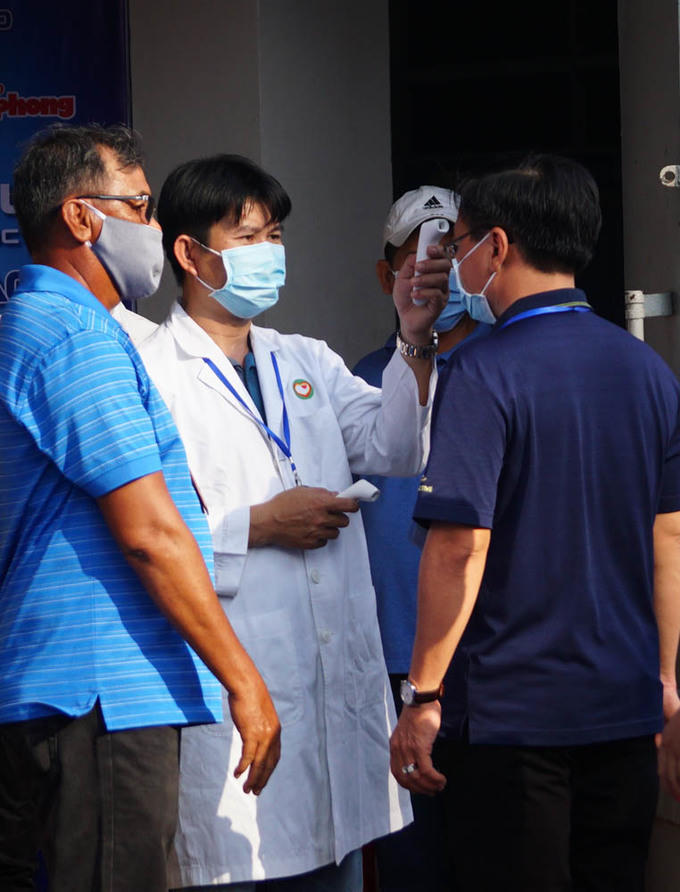 Một số nhân viên ban tổ chức, khách mời, cầu thủ, HLV... được kiểm tra thân nhiệt ở cổng, rửa tay bằng cồn mới có thể di chuyển vào sân.