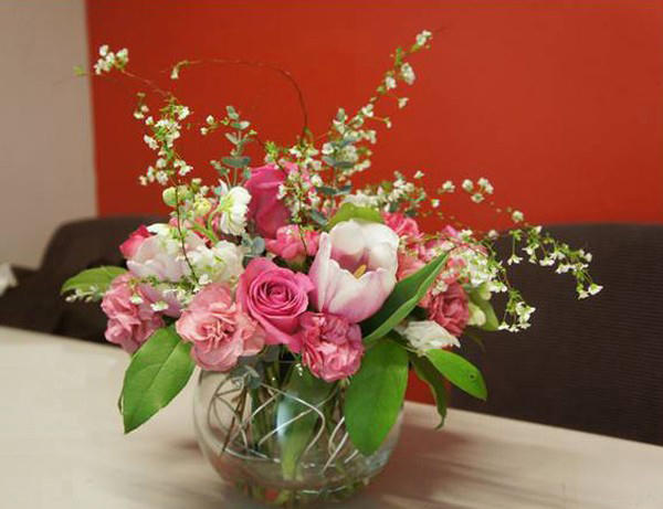 Với cách cắm hoa hồng kiểu này bạn có thể đan xen thêm một vài kiểu hoa khác nữa, phù hợp để trang trí bàn tiệc gia đình, hoặc bày lên bàn ăn cũng rất hợp lí.