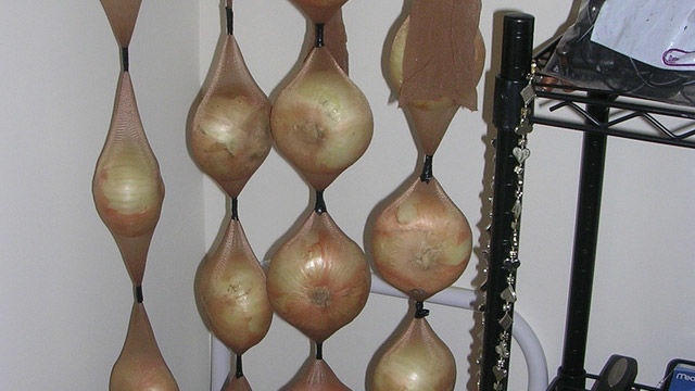 Bỏ hành tây vào tất, vặn nó lại theo từng quả và treo ở nơi tránh ánh sáng, bạn sẽ bất ngờ vị độ giòn ngọt của món này đấy.
