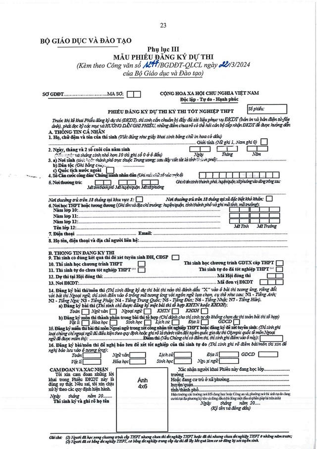 Mẫu phiếu đăng ký dự thi tốt nghiệp THPT 2024 |