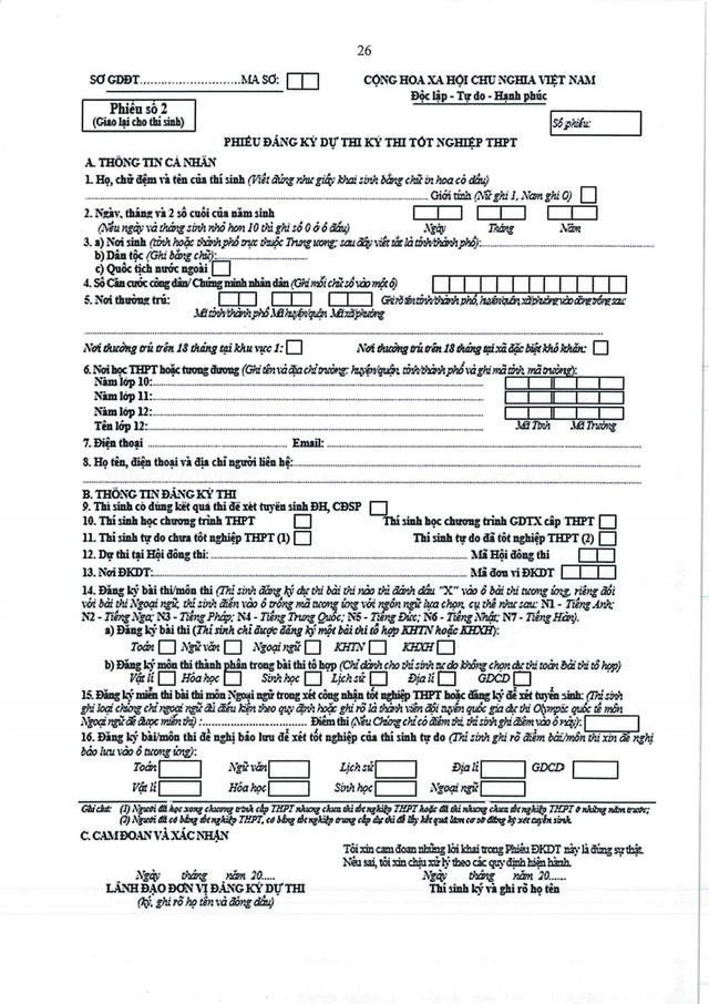 Bộ GD&ĐT lưu ý, trước khi khai phiếu đăng ký dự thi (ĐKDT), thí sinh phải đọc kỹ các mục và bản Hướng dẫn ghi phiếu. Những điểm nào chưa rõ thí sinh phải hỏi cán bộ tiếp nhận ĐKDT để được hướng dẫn đầy đủ. Thí sinh phải hoàn toàn chịu trách nhiệm về thông tin khai trong Phiếu ĐKDT.