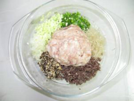 - Tiếp đến cho tất cả nguyên liệu làm nhân bánh vào 1 bát to. Dùng đũa trộn đều nhân thịt cho gia vị thấm đều.
