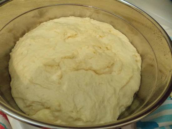 - Sau 1 - 2 tiếng, thấy bột nở, chọc nhẹ tay vào bột cho khí bay ra hết. Lấy bột ra nhồi cho hết khi và bột mềm mịn hơn. Sau đó vo thành 1 khối tròn to.