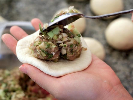 - Cho 1 ít thịt vào giữa vỏ bánh, sau đó bọc kín lại.