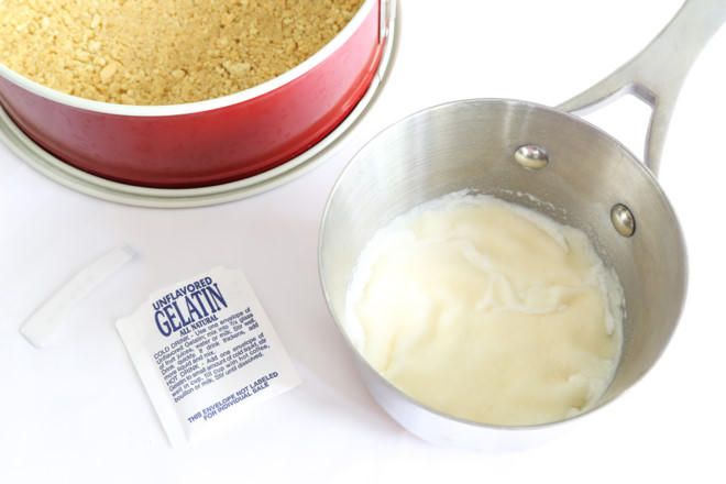 - Chuẩn bị một chảo nhỏ, đổ sữa vào chảo, sau đó rắc đều bột gelatin lên bề mặt sữa. Để 2 phút cho hỗn hợp lắng lại.