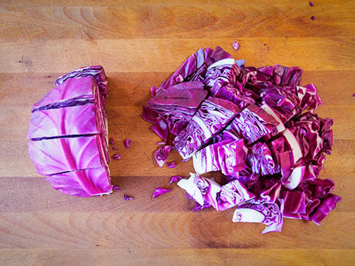 Bắp cải tím rửa sạch tái thành miếng nhỏ rồi cho vào máy xay, cho thêm 150ml nước vào đánh thành bột rồi cho qua rây lọc lấy nước màu tím.