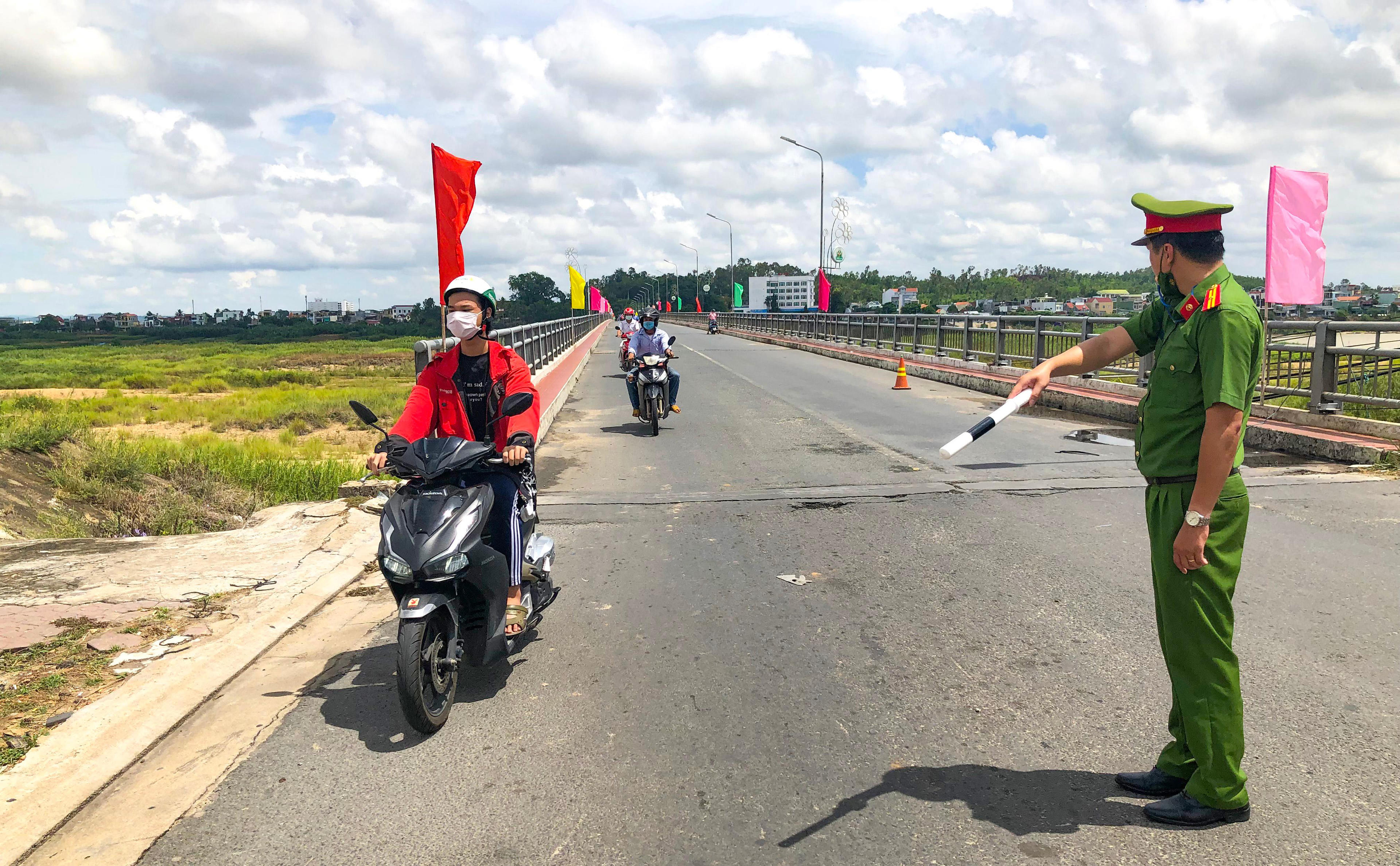 Lực lượng Công an đang thực hiện kiểm tra người dân đi qua các chốt trên địa bàn thành phố Quảng Ngãi. |