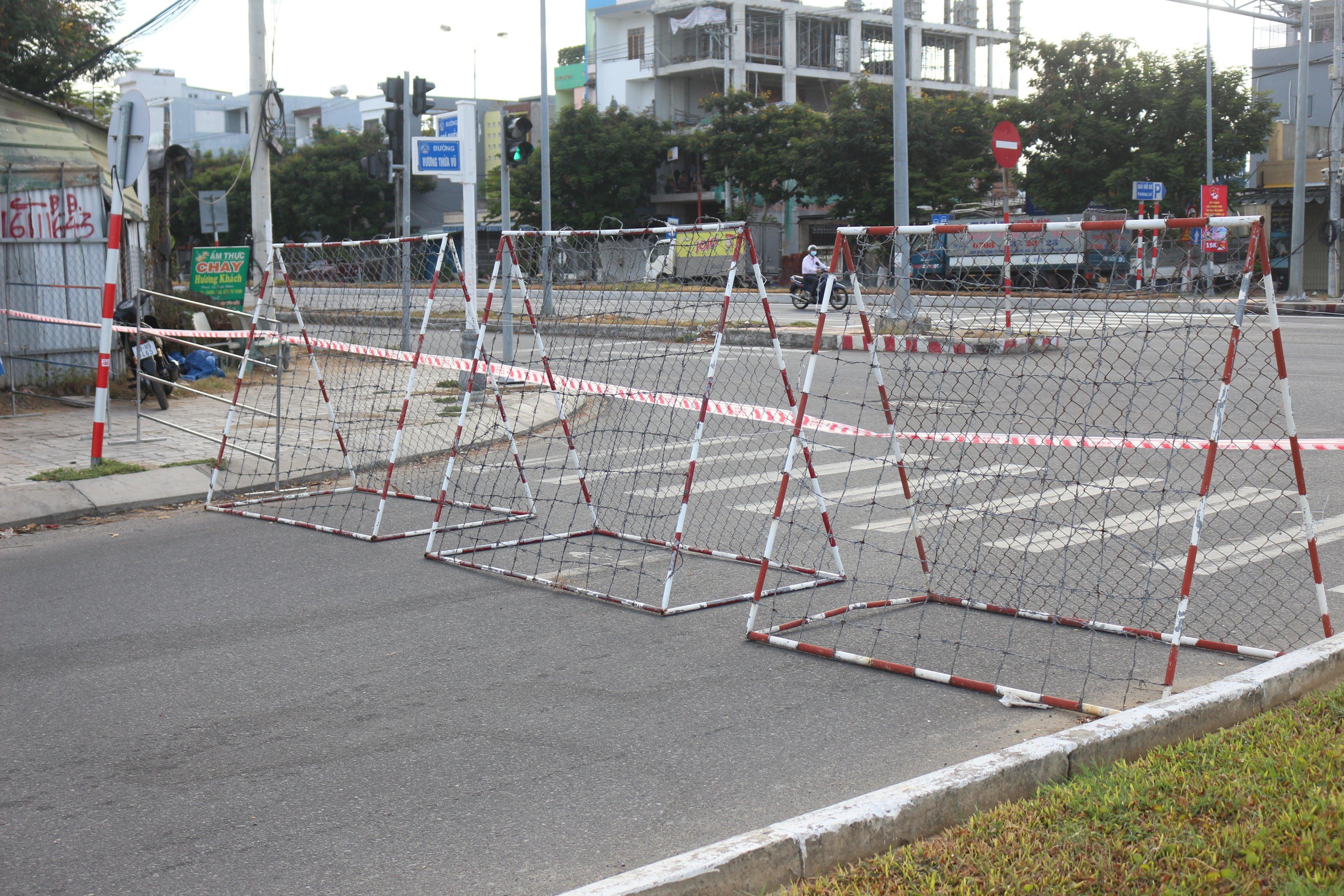 Lực lượng chức năng lập hàng rào cứng tại nhiều tuyến đường ở quận Sơn Trà. |