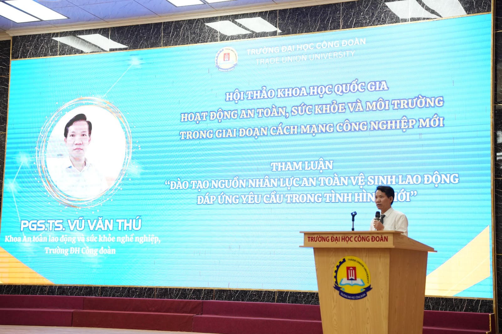 PGS.TS. Vũ Văn Thú - Trưởng khoa An toàn lao động và sức khỏe nghề nghiệp, Trường ĐH Công đoàn trình bày tham luận