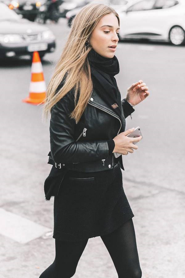 Áo khoác da sẽ tạo điểm nhấn cho mọi trang phục đơn giản như váy đen cơ bản.