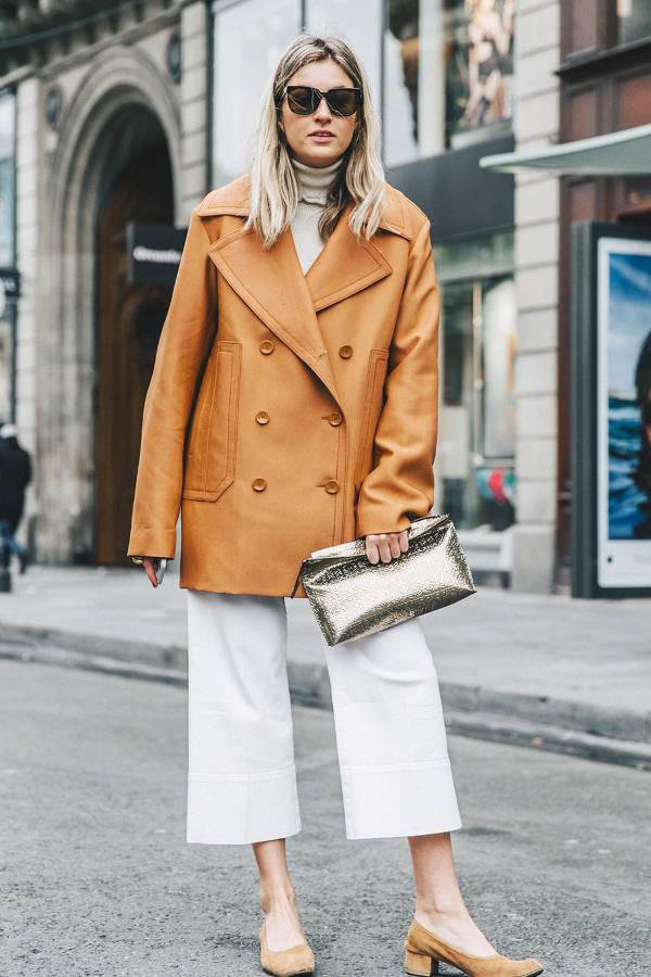 Cách để mặc quần trắng vào mùa đông là kết hợp cùng áo khoác nâu và áo cao cổ bên trong.