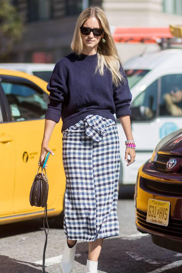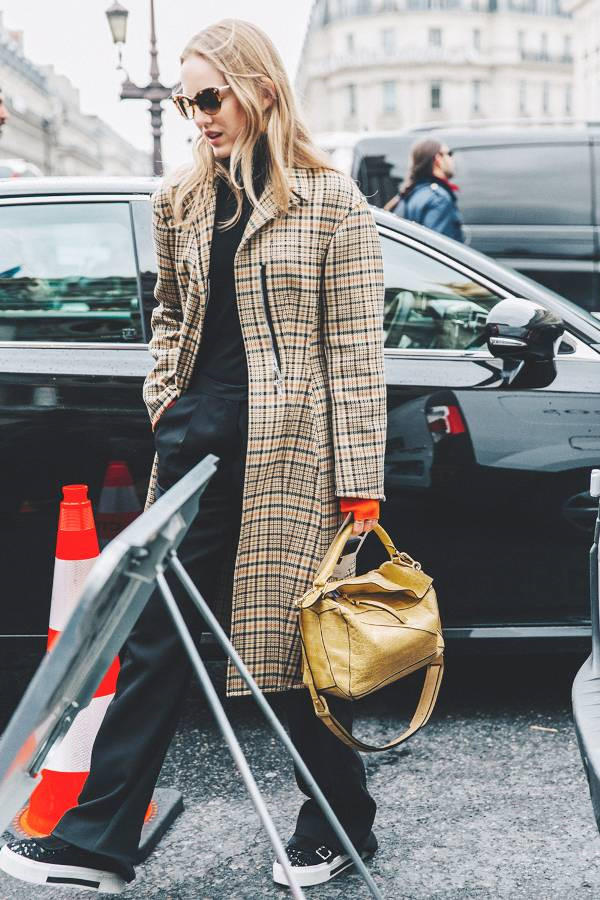 Áo khoác kẻ caro và giày thể thao sẽ làm set đồ trở nên thoải mái và phong cách hơn.