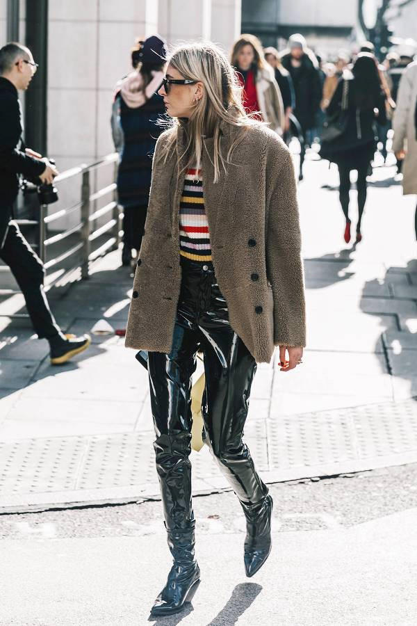 Bạn sẽ có set đồ vô cùng ấm áp mà vẫn sang chảnh với áo khoác lông kết hợp cùng leggings da.