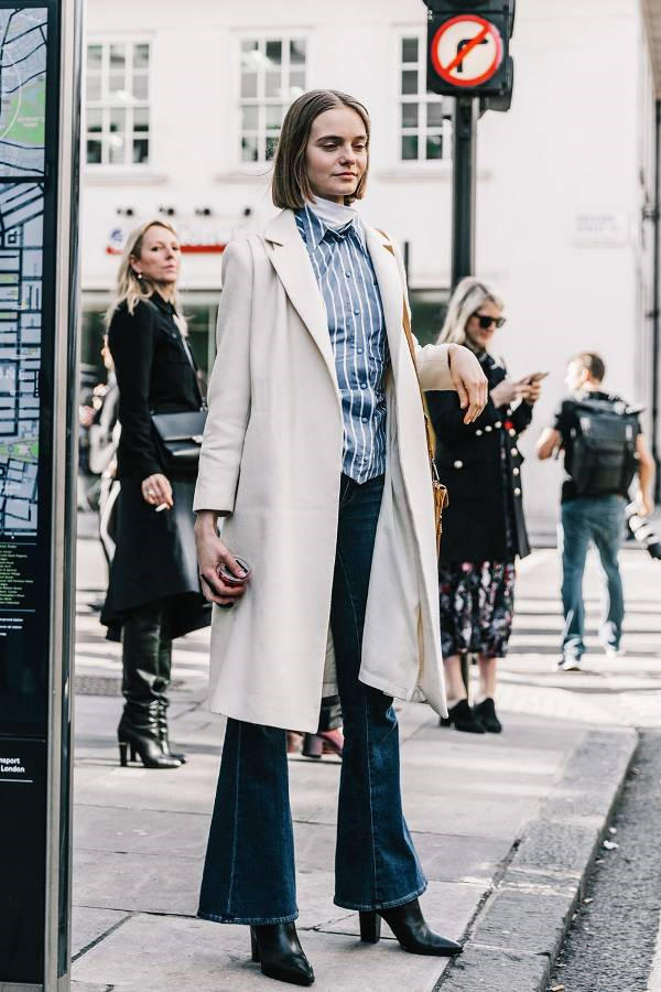 Sự kết hợp quần jeans ống loe, bốt và áo khoác dáng dài chắc chắn sẽ không thể thiếu trong tủ đồ mùa đông của các fashionista.