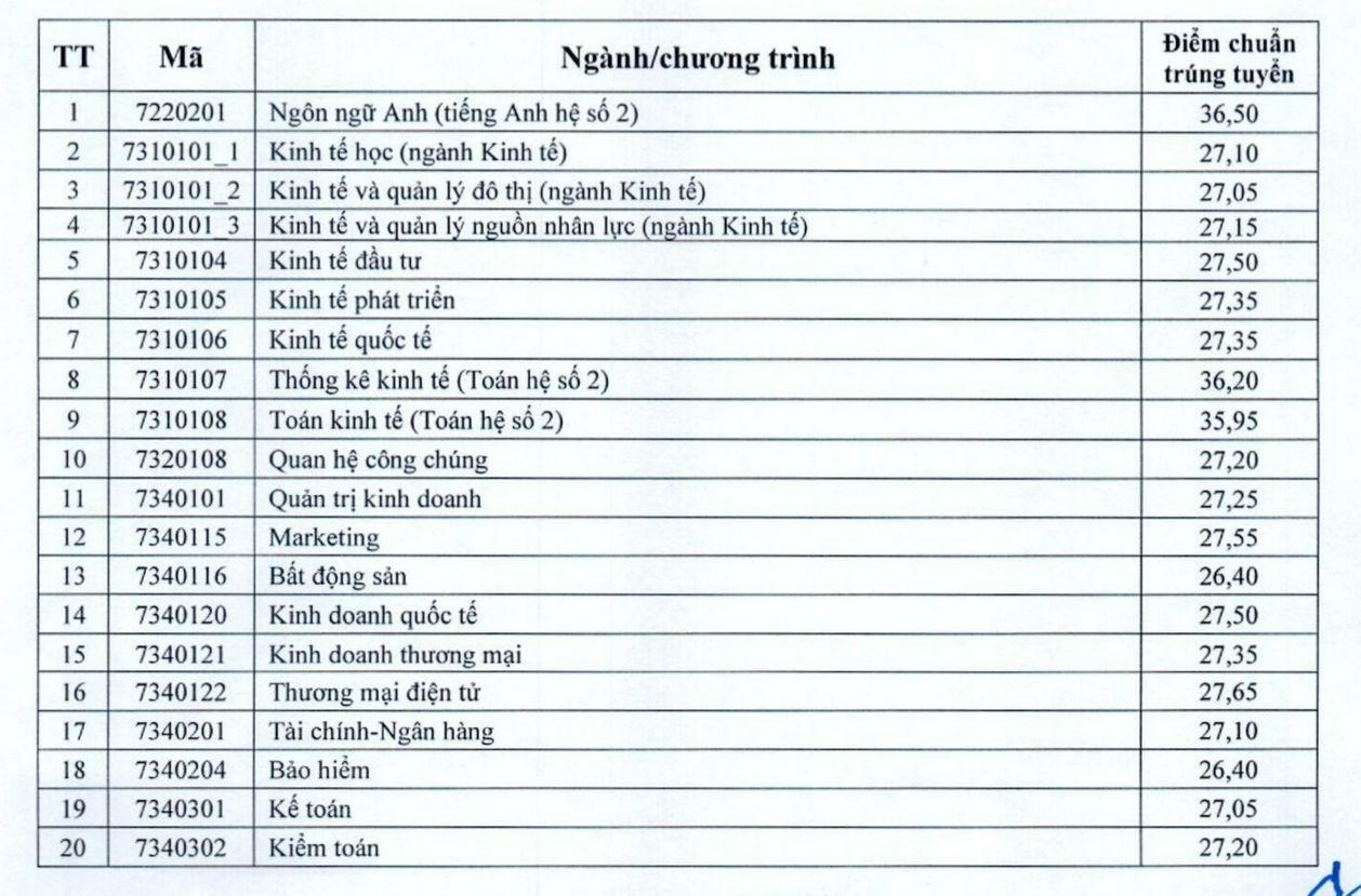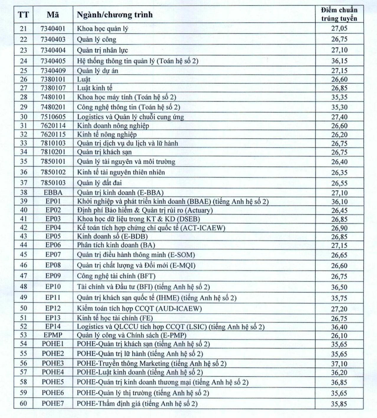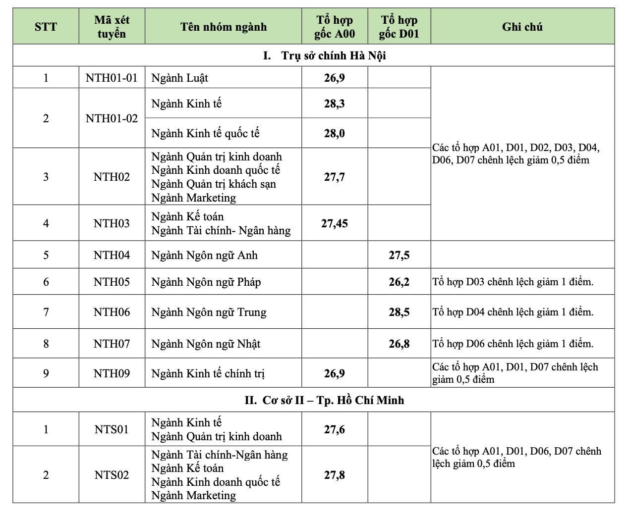 Điểm chuẩn cao nhất của Trường Đại học Thương mại năm nay là 27 điểm, thấp nhất là 24,50 điểm.