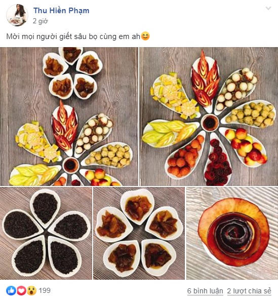 Mâm cỗ nhà chị Phạm Thu Hiền cũng được nhiều chị em yêu thích bởi bộ bát đĩa quá xinh xắn cùng với việc chị chăm chút, trang trí từng món khiến cho mâm cỗ trở nên bắt bắt hơn rất nhiều. Bên cạnh đó, nhà chị Hiền còn có thêm món bánh tro mật rất ngon.