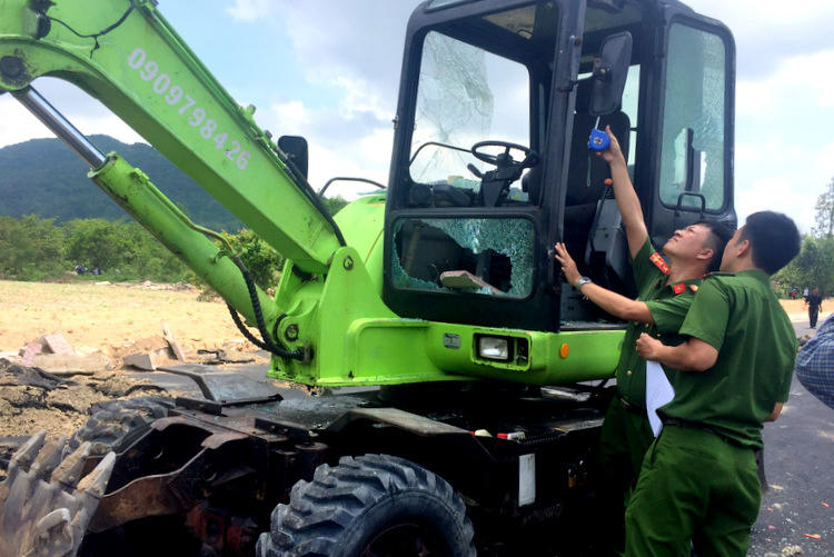Đoàn công tác vấp phải sự chống đối của cả trăm người mặc áo màu đỏ ghi dòng chữ “Tập đoàn địa ốc Alibaba”, không cho xe cuốc làm việc. Trong đó, bà Nguyễn Huỳnh Tú Trinh (24 tuổi, ngụ Tiền Giang, được gọi là “Giám đốc pháp lý”) liên tục lớn tiếng chỉ đạo các nam nhân viên và nhóm mặc áo ghi chữ “An ninh Alibaba” đập xe: “Đập xe múc nó cho chị, không cho bất cứ ai vào khu đất của mình”. Ai dùng điện thoại ghi hình cũng bị bà Trinh chỉ đạo người đến lấy điện thoại.
