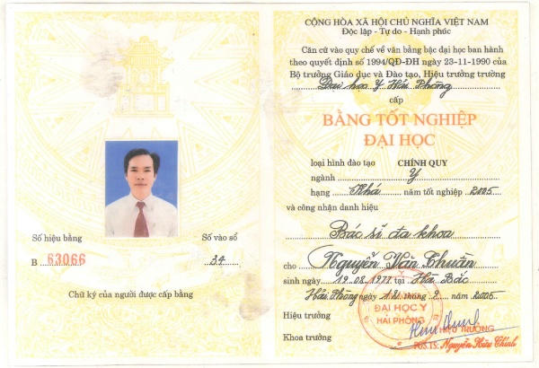 “Bằng đại học” được ông Thuần cung cấp cho thấy ông Thuần sinh năm 1977, quê quán Hà Bắc, tốt nghiệp loại Khá, hệ Chính quy của Đại học Y Hải Phòng năm 2005 và được công nhận danh hiệu: Bác sỹ đa khoa.