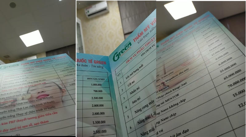 Khi PV đề nghị được giảm giá sâu hơn, vị này rằng: Tại thẩm mỹ có lắp camera, do đó, số lượng khách hàng ra vào, sử dụng dịch vụ gì đều được phía Bệnh viện quốc tế Green kiểm soát chặt chẽ. Cùng với đó, PV được tư vấn về bảng giá các gói dịch vụ từ đơn giản như mát xa, chăm sóc da, triệt lông đến những thủ thuật phức tạp như nâng ngực, nâng mũi…