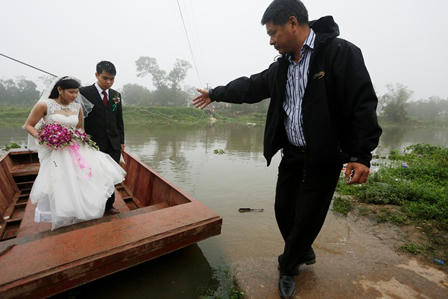 Không có cầu hay con đường nào khác, một đám cưới ở ngoại thành Hà Nội buộc phải chia đôi đoàn để đi trên chiếc đò dây đưa cô dâu qua sông.
