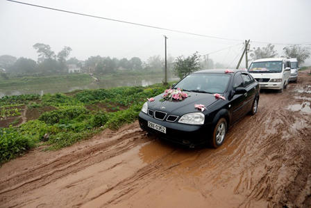 | Đoàn rước dâu vừa vất vả qua sông thì gặp phải con đường sình lầy ngay sau đó vì cơn mưa trước đó một ngày. |