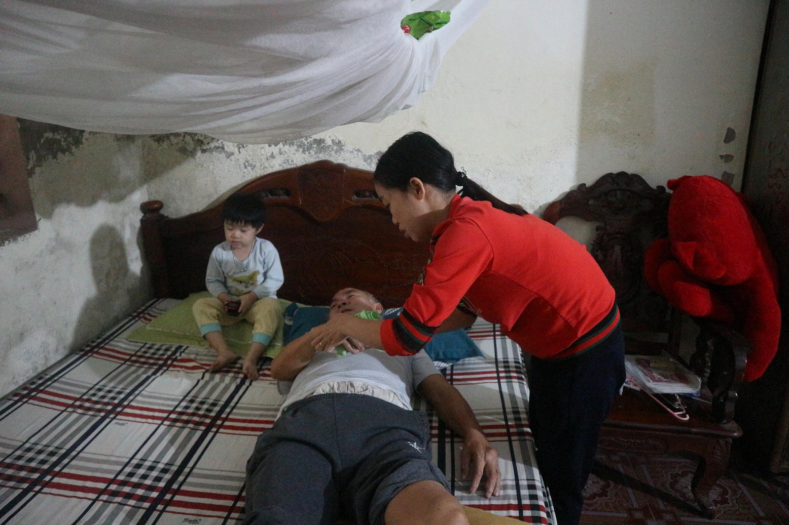 Ngồi ôm đứa con nhỏ, chị Hoa rơi nước mắt khi kể về những biến cố ập đến gia đình mình. Đầu tiên là bố chồng của chị - ông Đinh Văn Việt (60 tuổi) phát hiện bị bệnh tim. Căn bệnh nguy hiểm kèm theo các bệnh khác như gút, đau dạ dày…càng khiến sức khỏe ông giảm sút. Hàng loạt chứng bệnh cùng lúc hành hạ khiến ông đau đớn, không thể đi lại được, phải nằm một chỗ. Do đó, mọi sinh hoạt cá nhân đều nhờ sự hỗ trợ của vợ và con dâu.